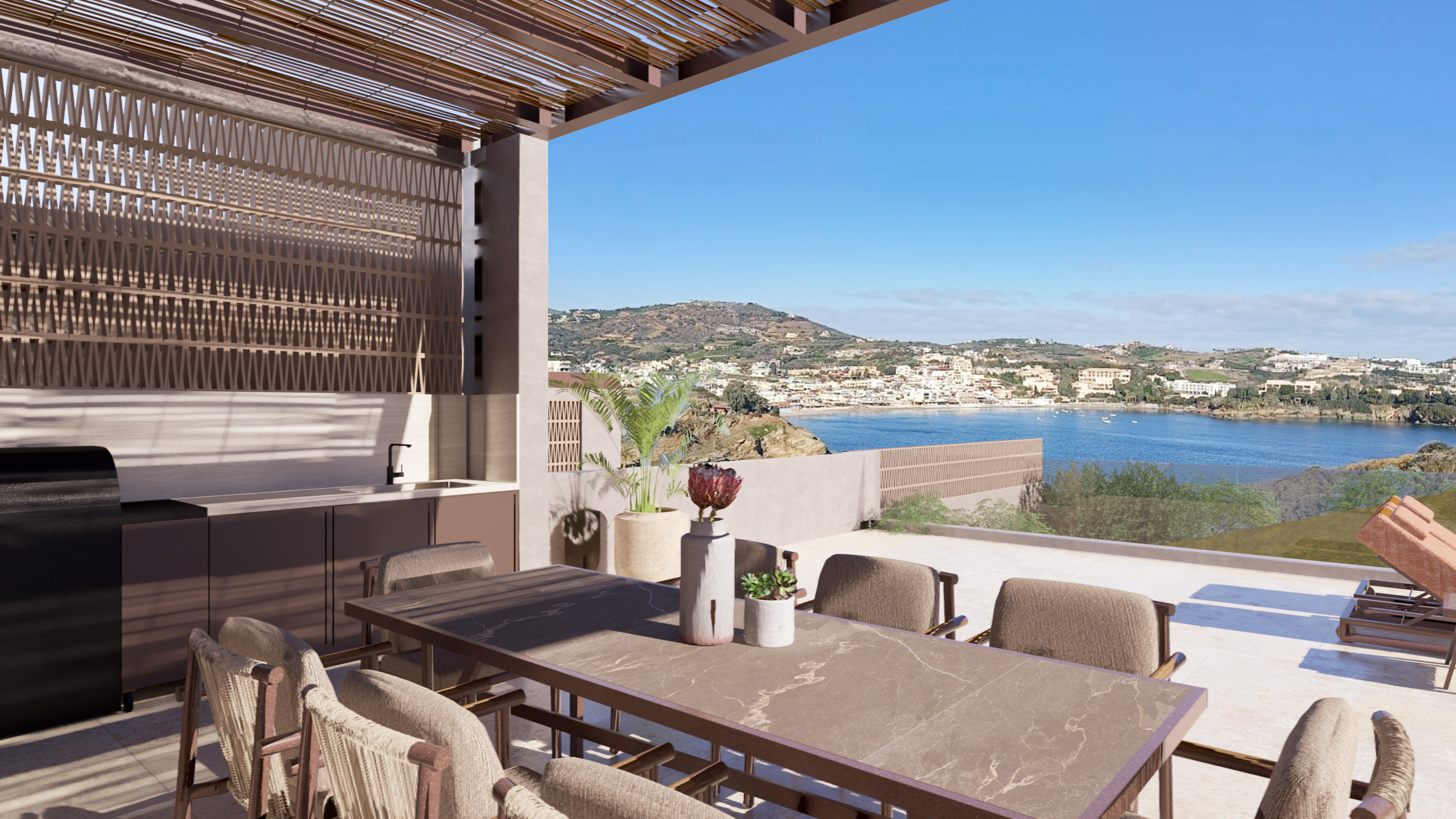 a hyper realistic image of a veranda area with swimming pool overlooking the sea view