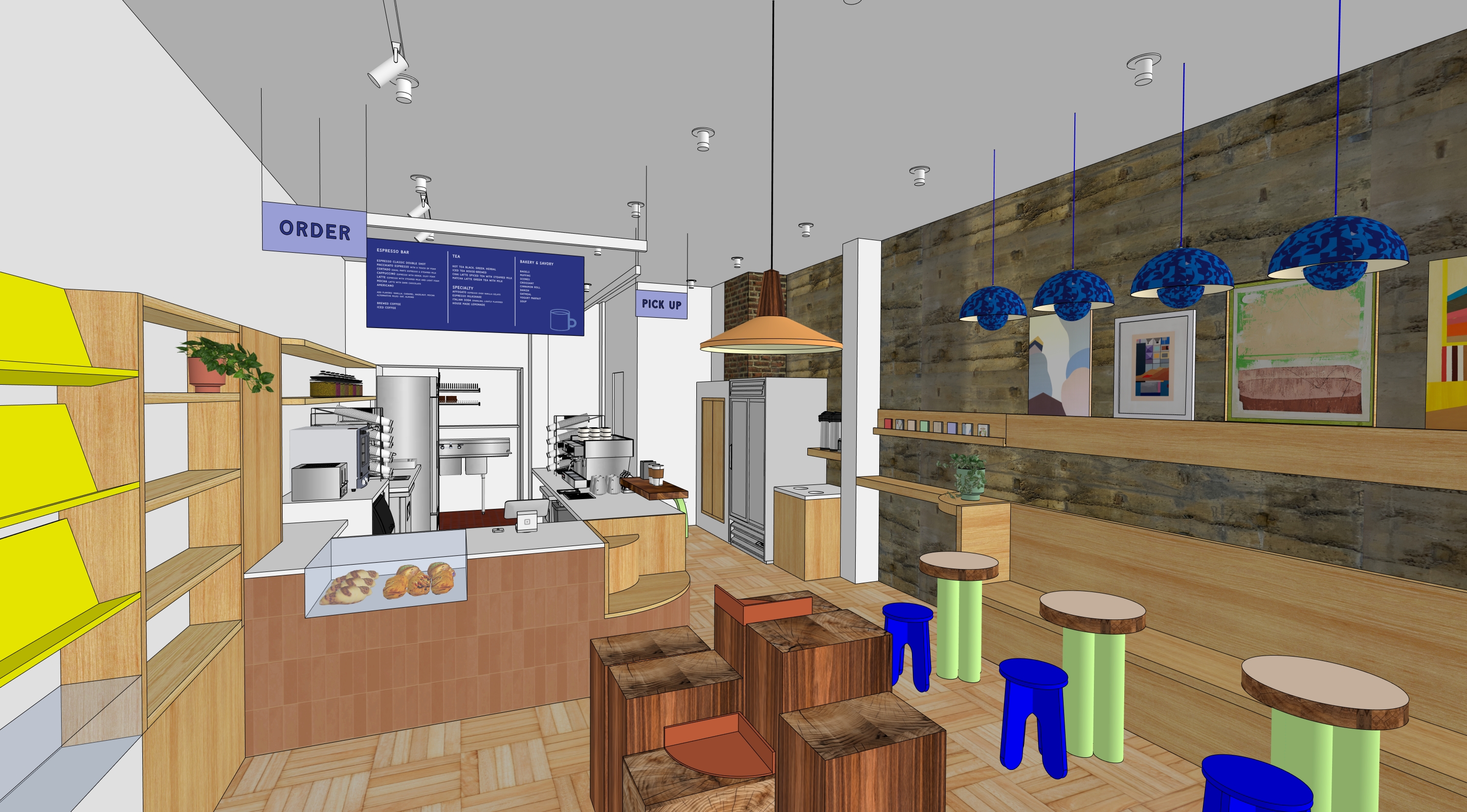 this is an interior image of a coffee shop make the lighting soft natural light with a soft glow coming from the pendant lights and the lighting on the ceiling the facade of the serveline is terra cotta colored tile the tabletops are burly walnut with a pale tan laminate on top the table legs are lime green powder coated metal the center bottom table in the image is rough hewn dark wood timbers with the tops sanded to be a surface for display there are yellow shelves on the left of the image do not change any finishes or the structure of the image there are no windows visible in this image