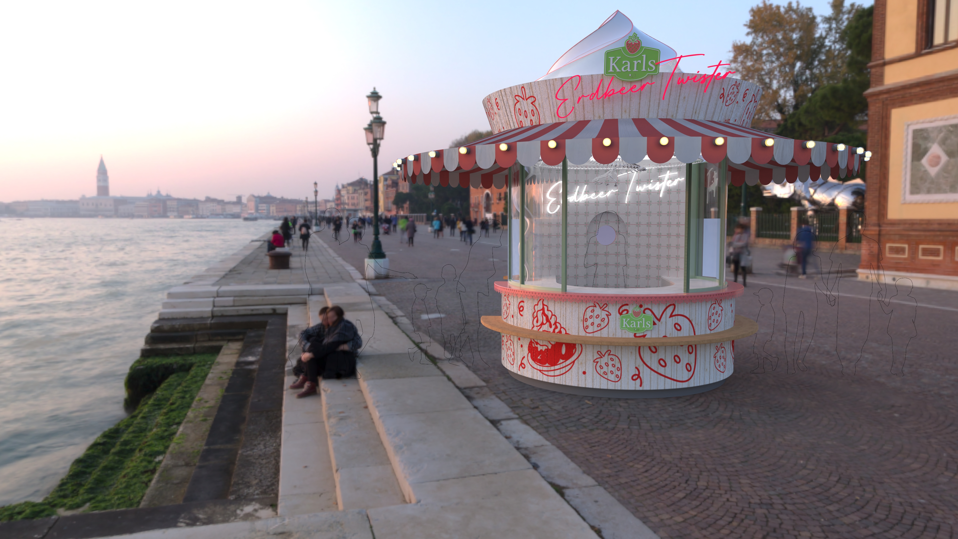during a sunny day sun in the forground daylight in a charming urban environment bright interior people queuing open pedestrian area with some plants in sight
