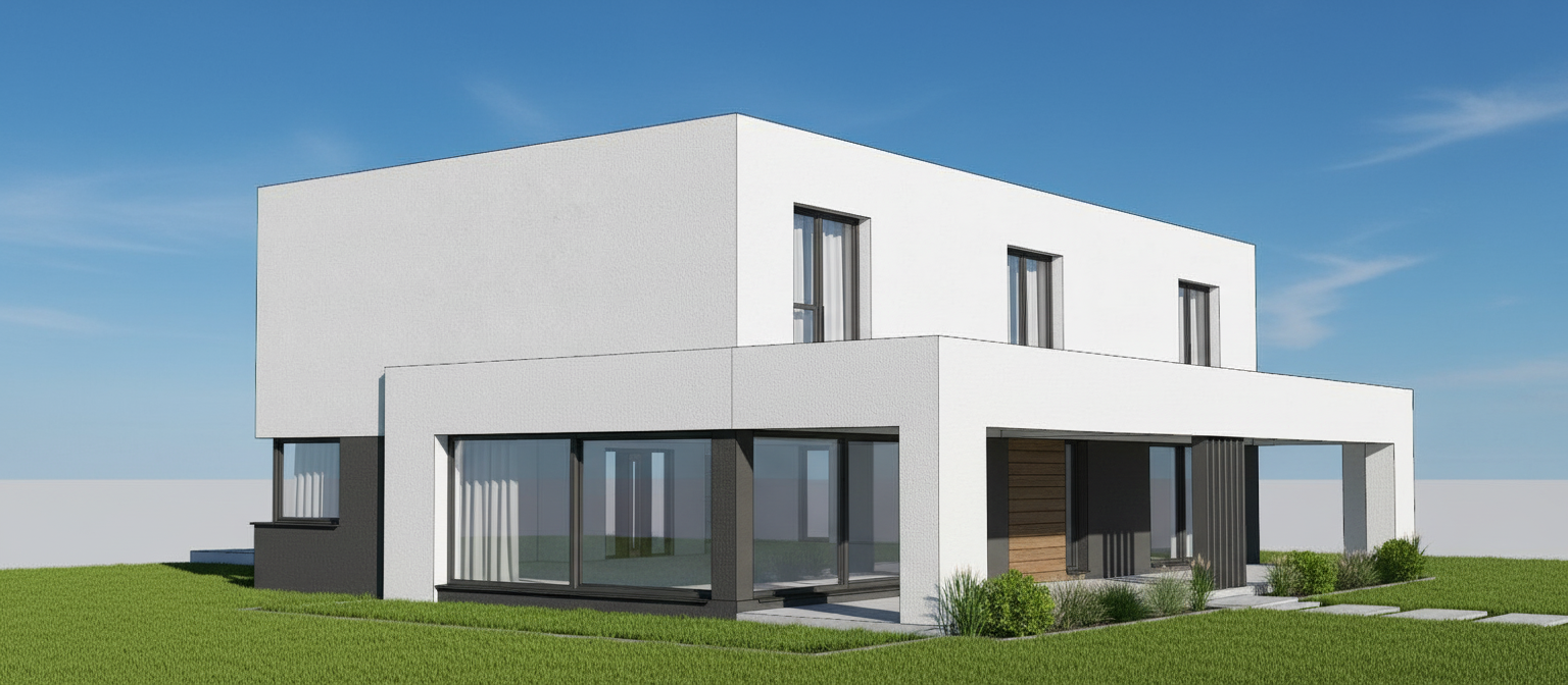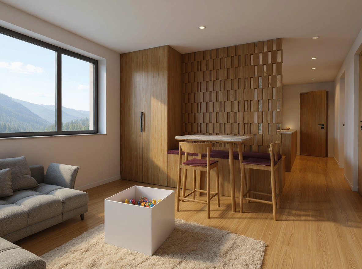 interior shot make a fotorealistic render of the image with glossy tiles on the wall mat tiles ont he floor an organic mirror and wooden slats on the white parts around the windows architecture