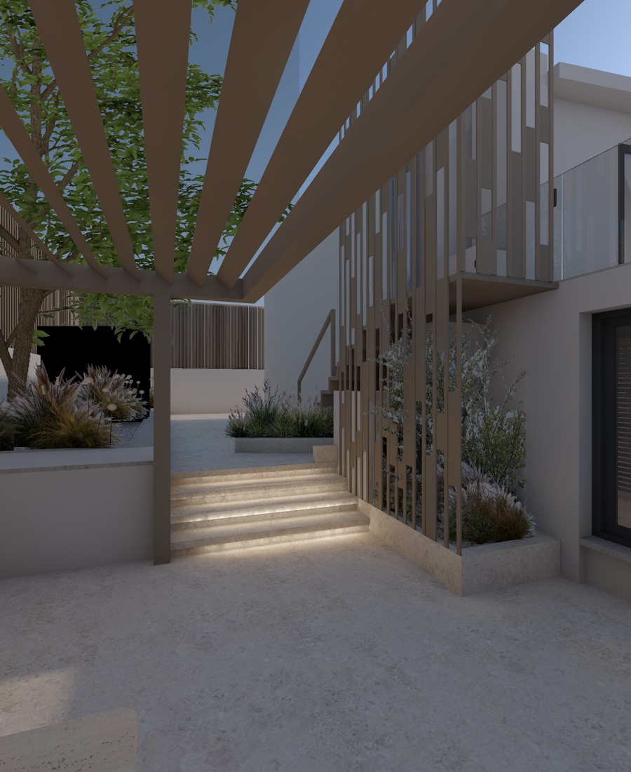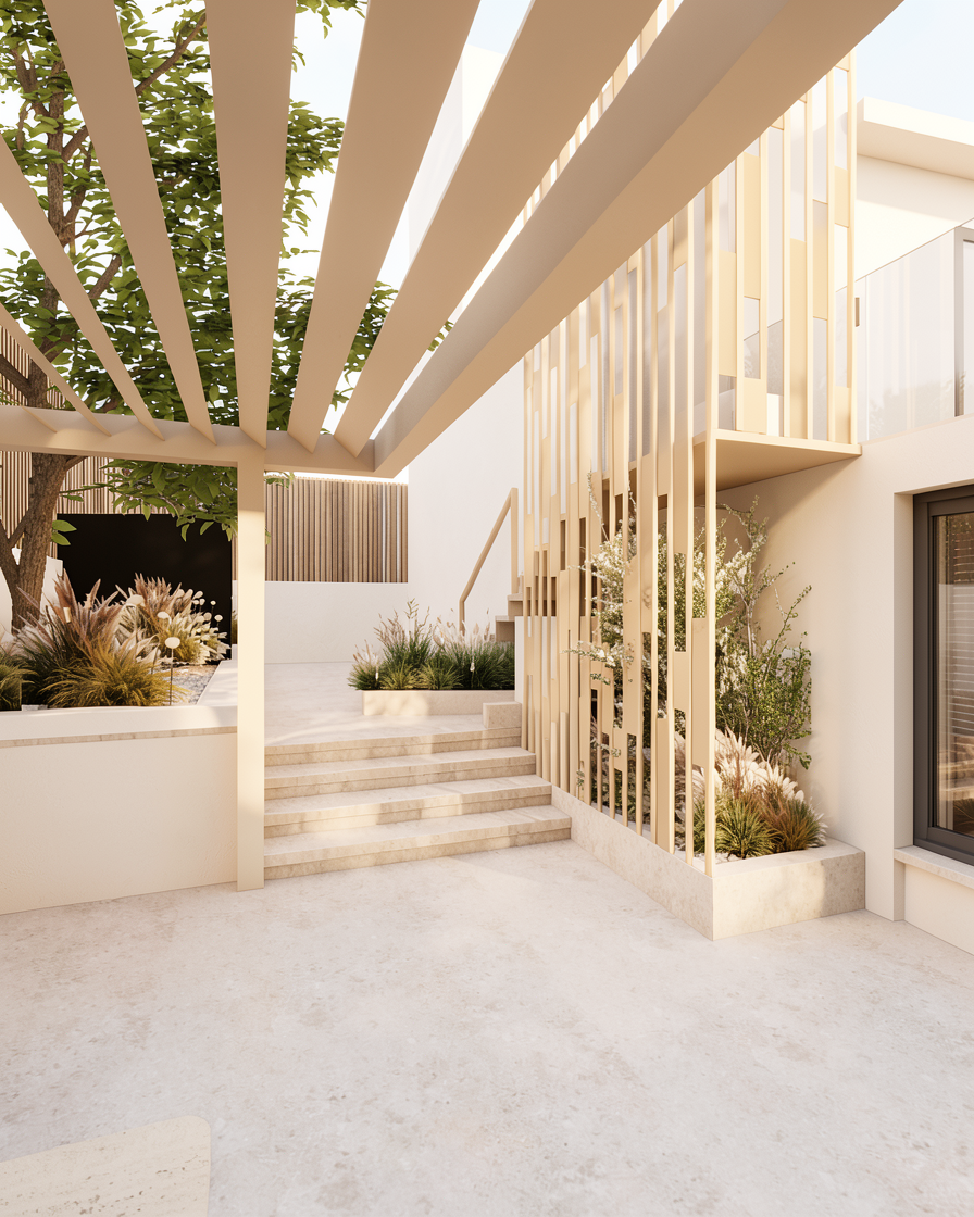 a calm elegant contemporary outdoor courtyard with a minimalist architectural language the scene features a tall central decorative screen made of vertical beige slats creating a refined semi transparent partition and adding rhythm depth and visual lightness to the composition the surrounding walls are smooth warm white plaster keeping the palette soft and understated lighting should be soft and natural like late afternoon daylight with gentle shadows and a calm luxurious mood the final render should look refined realistic and architectural with strong material clarity and a high end design feel light beige color at the walls remove the black rectangular back in the plants