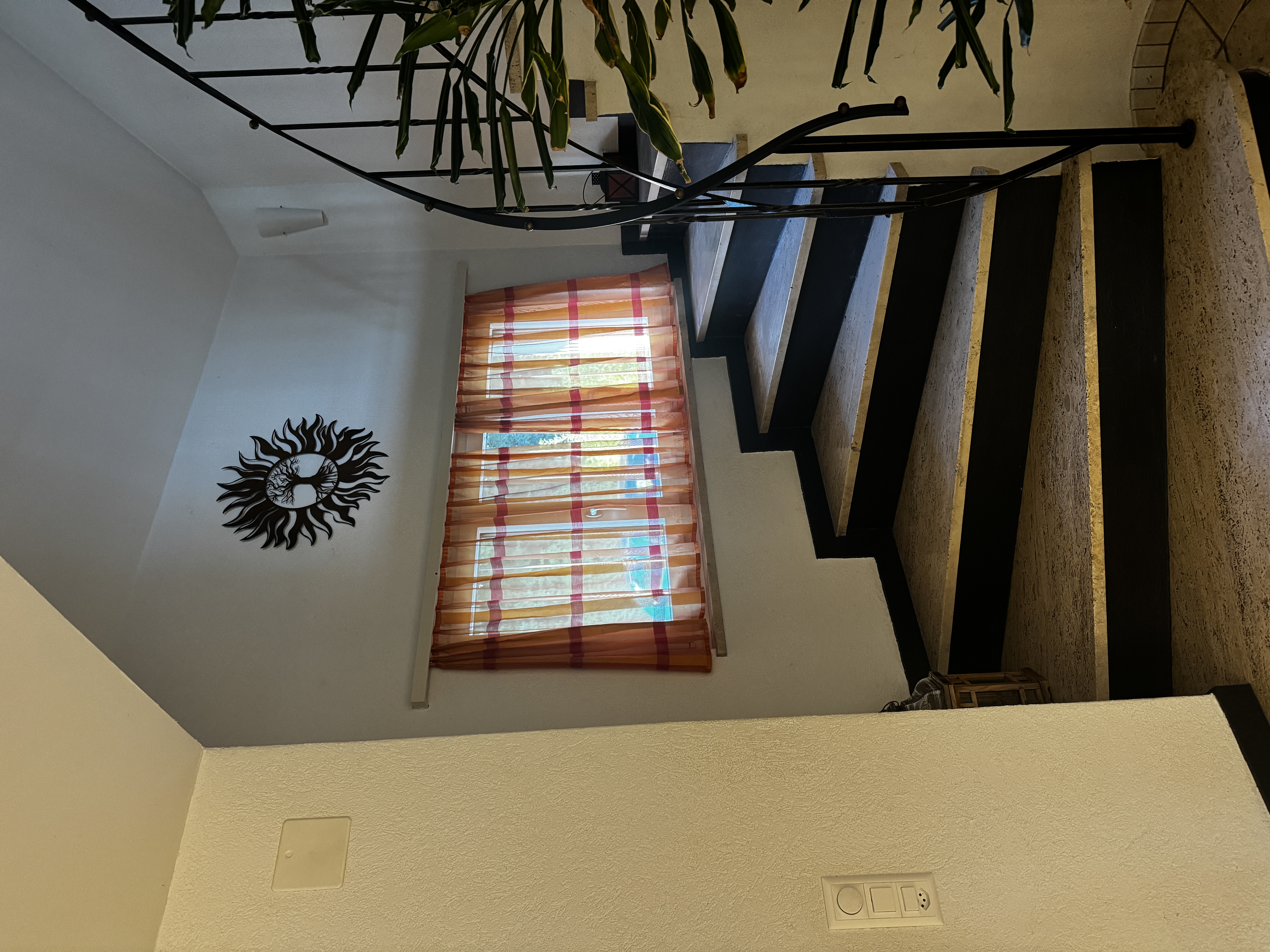 keep the exact original perspective camera angle proportions lighting and all architectural elements exactly as they are do not modify the staircase walls floor ceiling window frame shadows or overall composition remove the curtains completely replace only the glass surface of the window with a custom printed window film the window frame and surrounding elements must remain 100 unchanged the film should feature a high end stylish contemporary artwork that looks sophisticated and perfectly suitable for an interior design presentation the design should feel refined architectural and elegant not playful not decorative the film must appear realistically applied directly onto the glass surface slightly translucent allowing soft diffused daylight to pass through natural light interaction must remain realistic and consistent with the original image the result should look like a premium interior design concept visualization ultra realistic no camera movement no new objects no changes outside the glass area