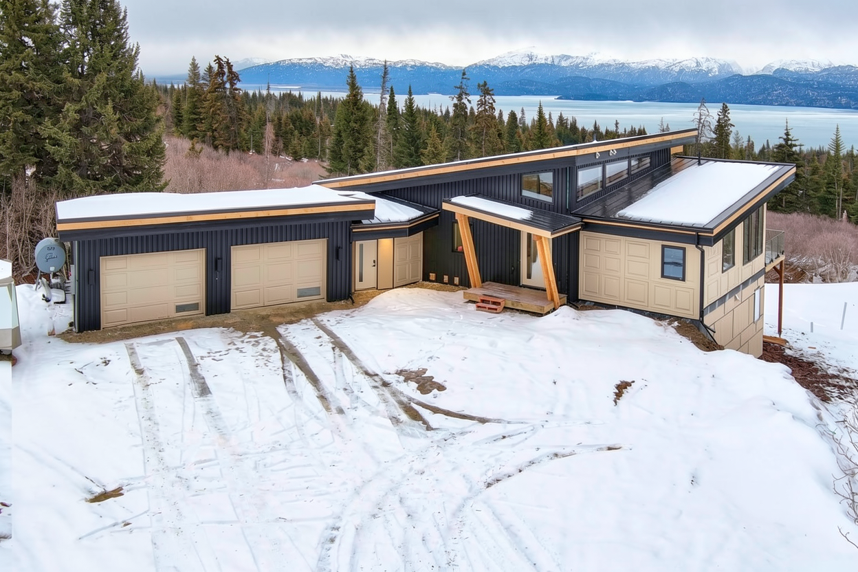 a manicured lawn layered flower beds low low maintenance shrubs native plants a stone pathway leading to the entrance large trees behind the house a red front door light brown metal siding dark brown metal trim a concrete driveway leading to the garage door with a red pickup truck in the driveway