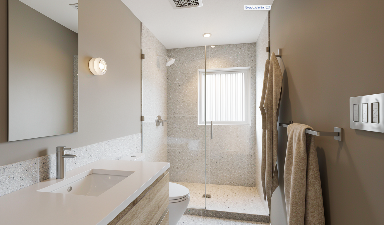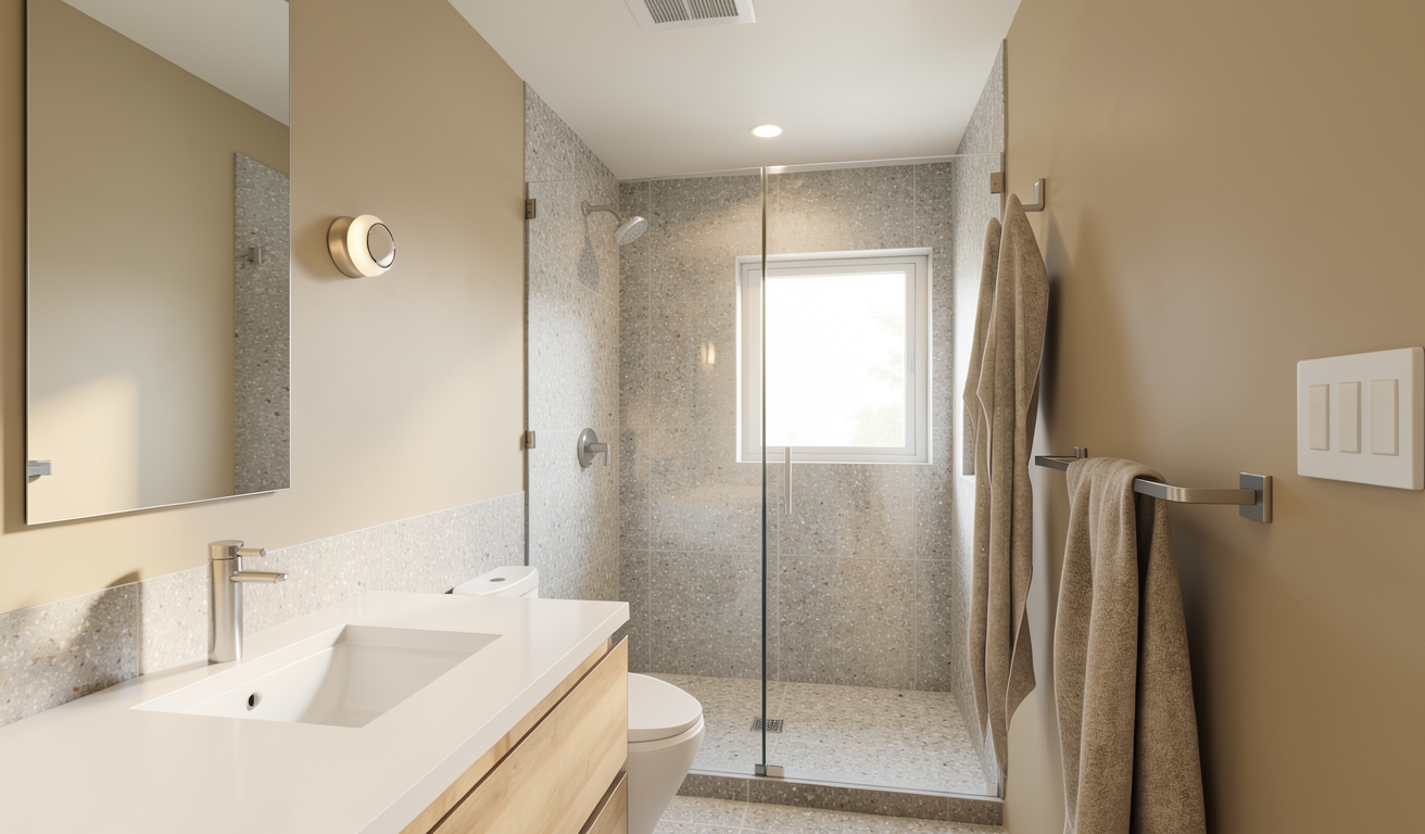 maintain all colors materials and textures shower glass light warm grey walls white countertop light grey terrazzo tile