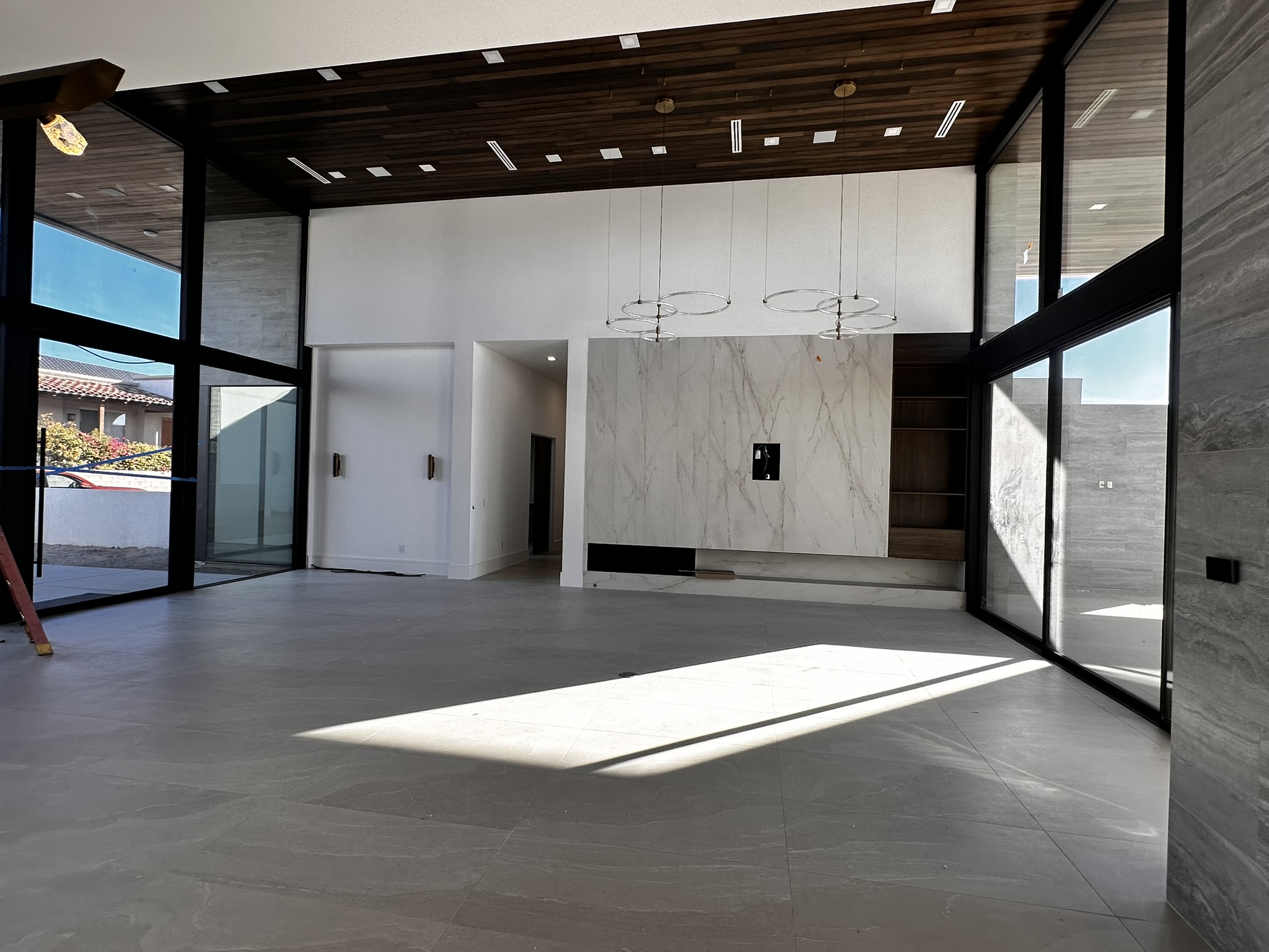 add a modern couch set seating area to the far space oriented toward the far wall add a long dining table in the foreground oriented left right remove orange ladder add arizona landscaping outside the galss at the left in front of the white low wall turn the circular ceiling pendant on over the couches