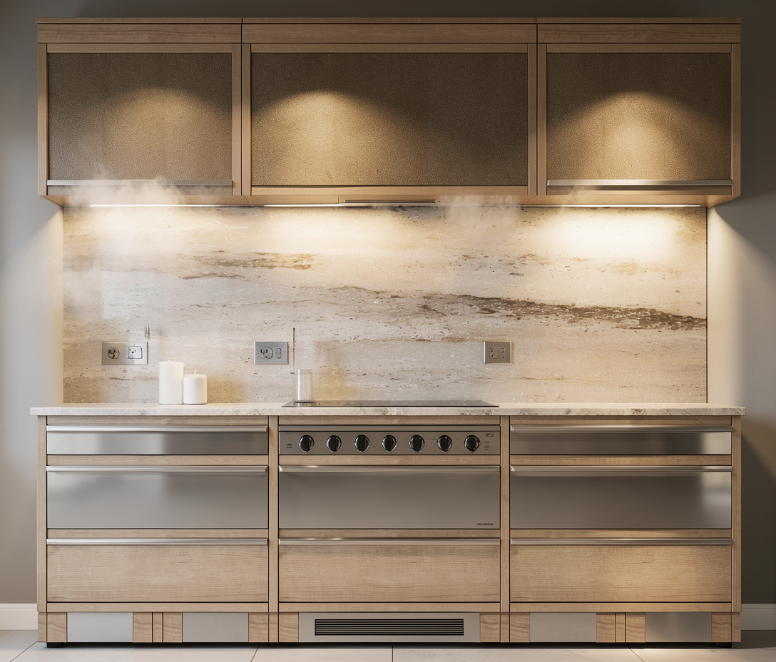 render a closet that has six doors in the side they are a dark walnut matte wood and in the middle are dark glass that the inside can be seen there are led stips inside that iluminate the clothes hanging there in the side there is a tall window that has a second floor view the closet gives a elegant feeling