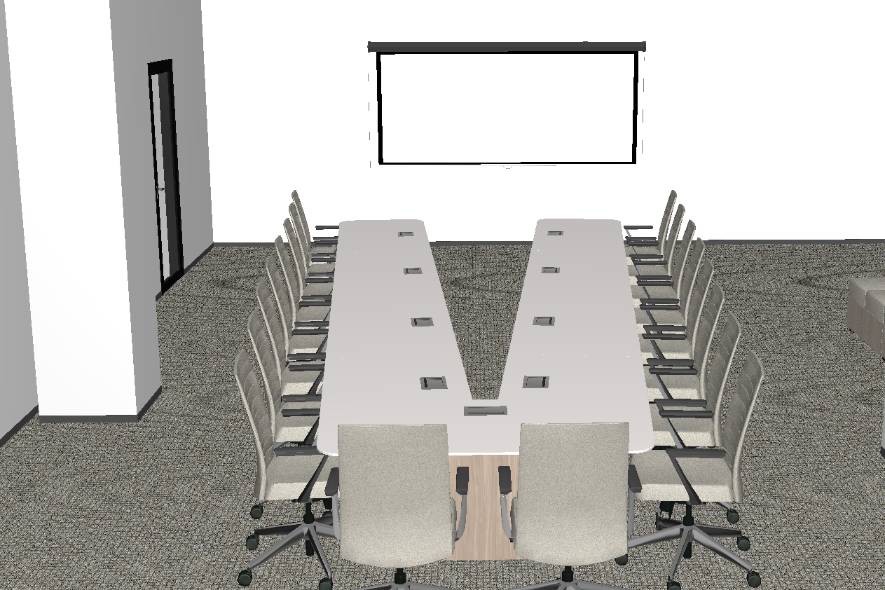 add decor make more realistic and add professional people do not change any of the furniture or materials add recessed lighting put writing on two whiteboards wall mounted next to the projector