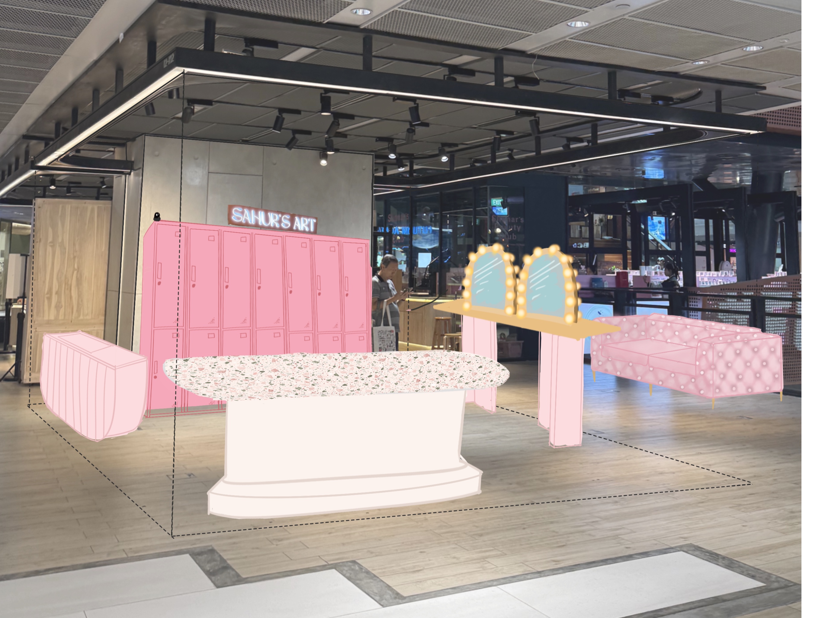 modernist interior shot tabletop is pink and green terrazzo architecture