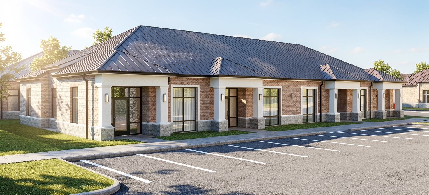 an open office training room with rows of rolling office chairs and long rectangular tables arranged facing a front wall the ceiling is a suspended grid system with square acoustic tiles and recessed linear light fixtures in a parallel layout flooring consists of dark gray patterned carpet tile throughout walls are primarily white with on dark gray and one solid blue painted accent wall and floor to ceiling glass partitions framed in dark metal along the perimeter furniture includes black mesh task chairs with metal frames and a large wall mounted flat panel display at the front of the room