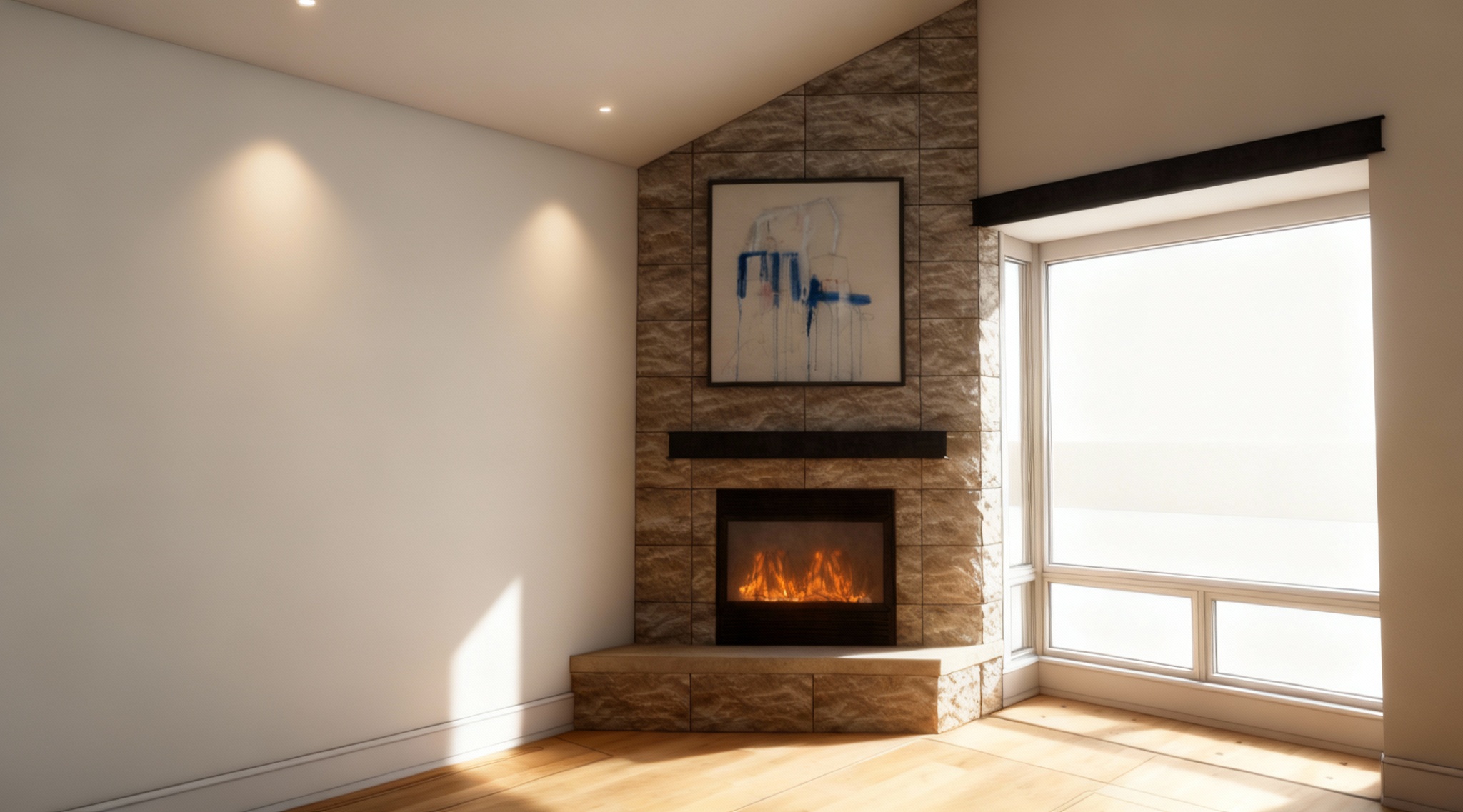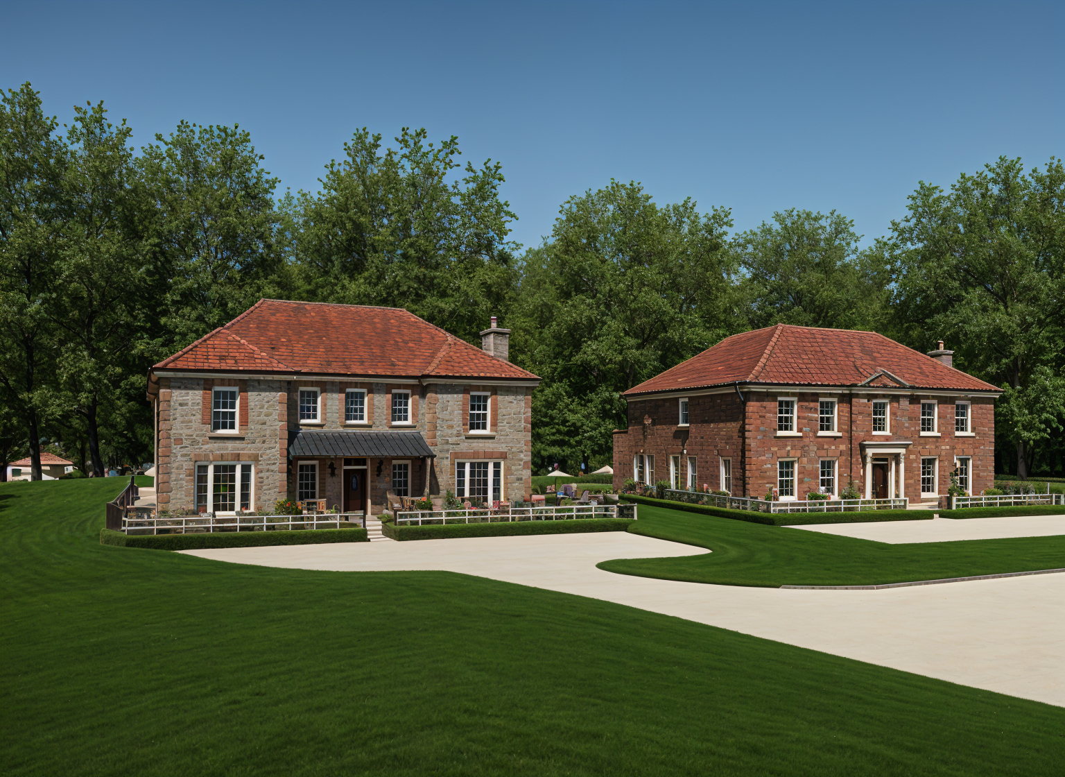 white warm stucco exterior black horizontal metal siding brick veneer black trim around windows black metal slats a very cloudy slightly moody midafternoon sky following a light rain with a mix of cumulus clouds concrete sidewalk photorealistic render