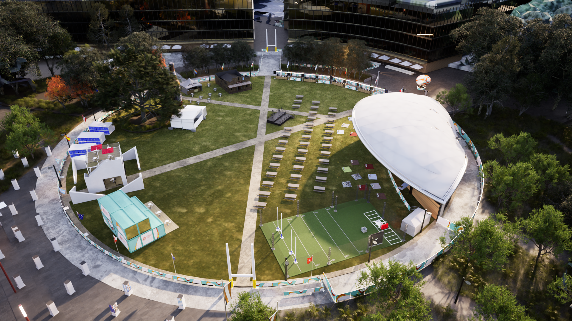 add a mix of 1000 people standing around the grass areas and watching sport the stage in the image 50 percent of the people are cheering towards the tv screen show people socialising show kids playing on the sports field make the people 1 6m high