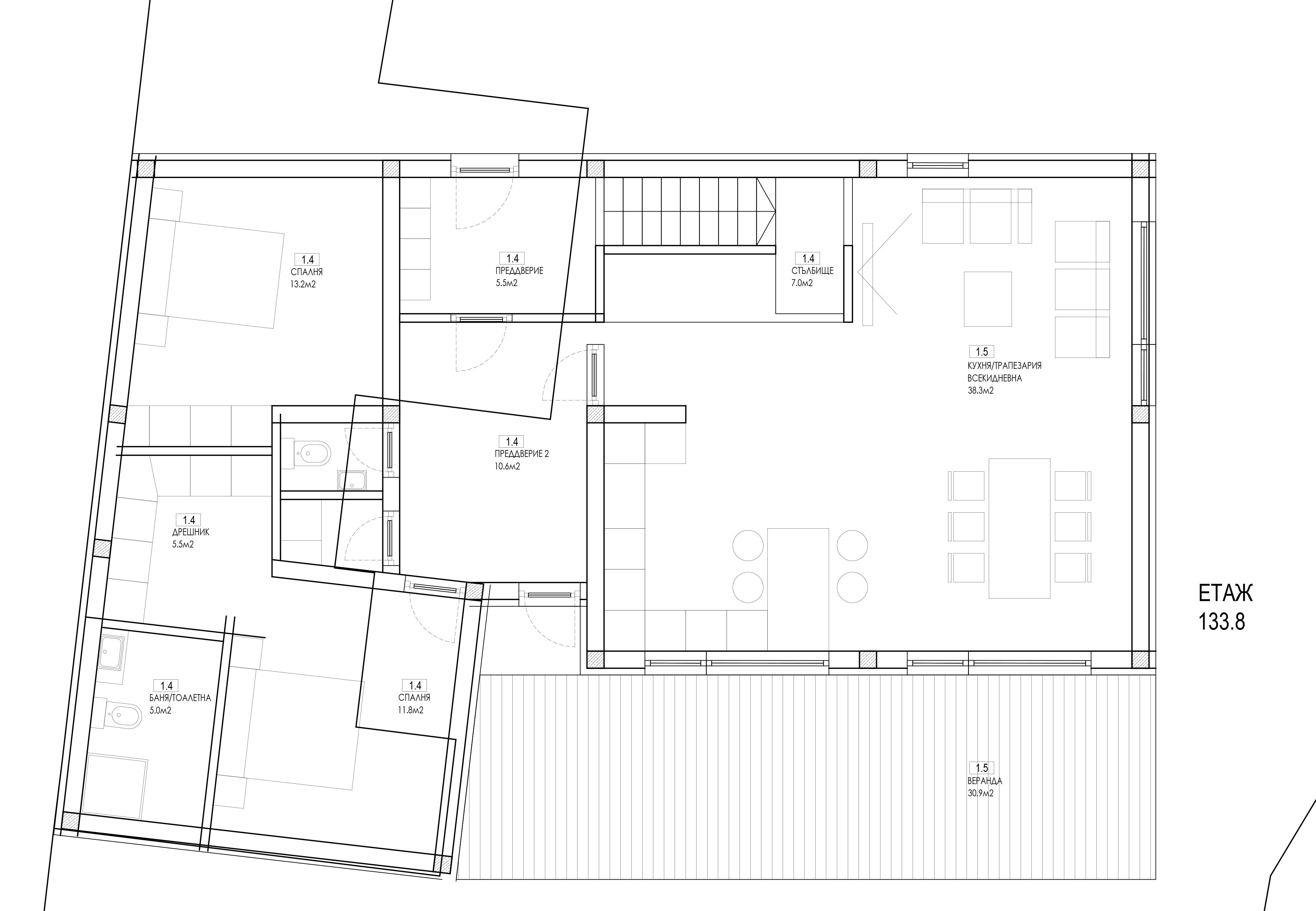 convert this floor plan into a realistic isometric 3d view of a full house show the space from an elevated angle with furniture walls and details visible contemporary urban house japandi style use the same furniture as shows on the plan do not change the orientation of the floorplan