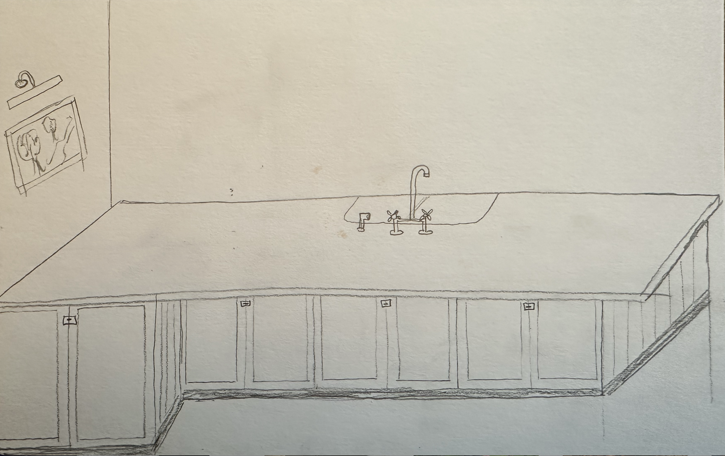 dark green cabinets with brass apothecary latches white farmhouse sink on far side of peninsula brass faucet white quartz countertop vintage art on the wall on lefthand side of peninsula with brass picture light above