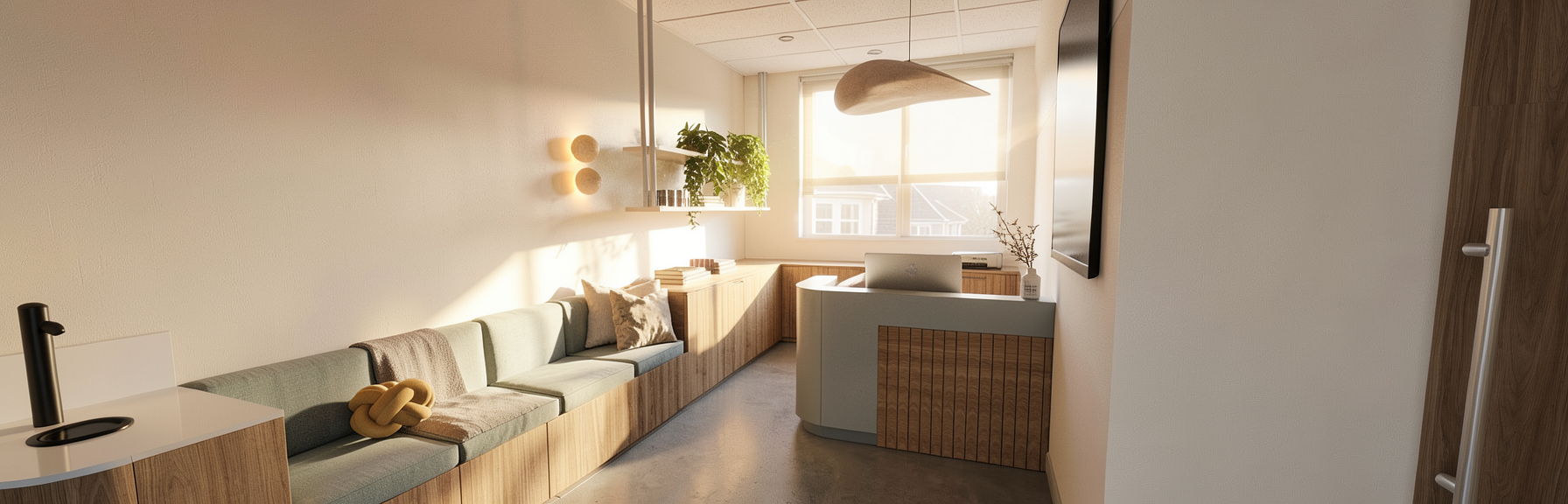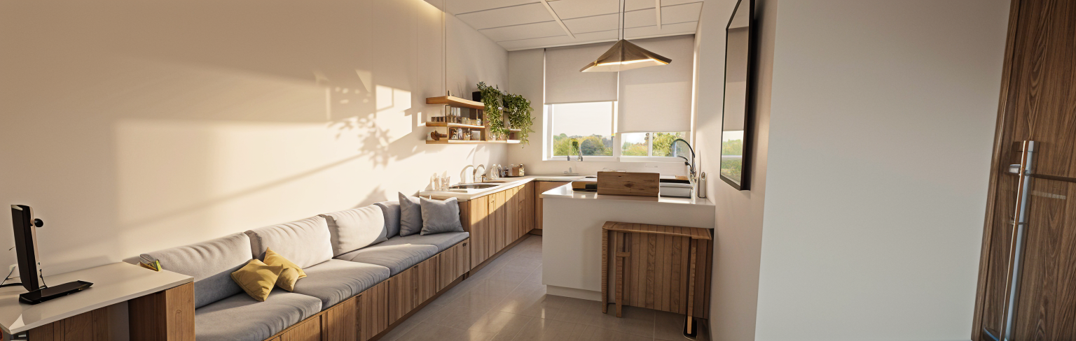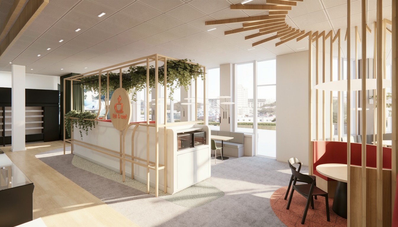 create a modern airy cafeteria interior with clean lines and a welcoming atmosphere use light wood tones for the ceiling slats wall dividers and round table ensure large windows fill the space with natural lighting entering offering views of a cityscape the atmosphere should feel inviting and contemporary