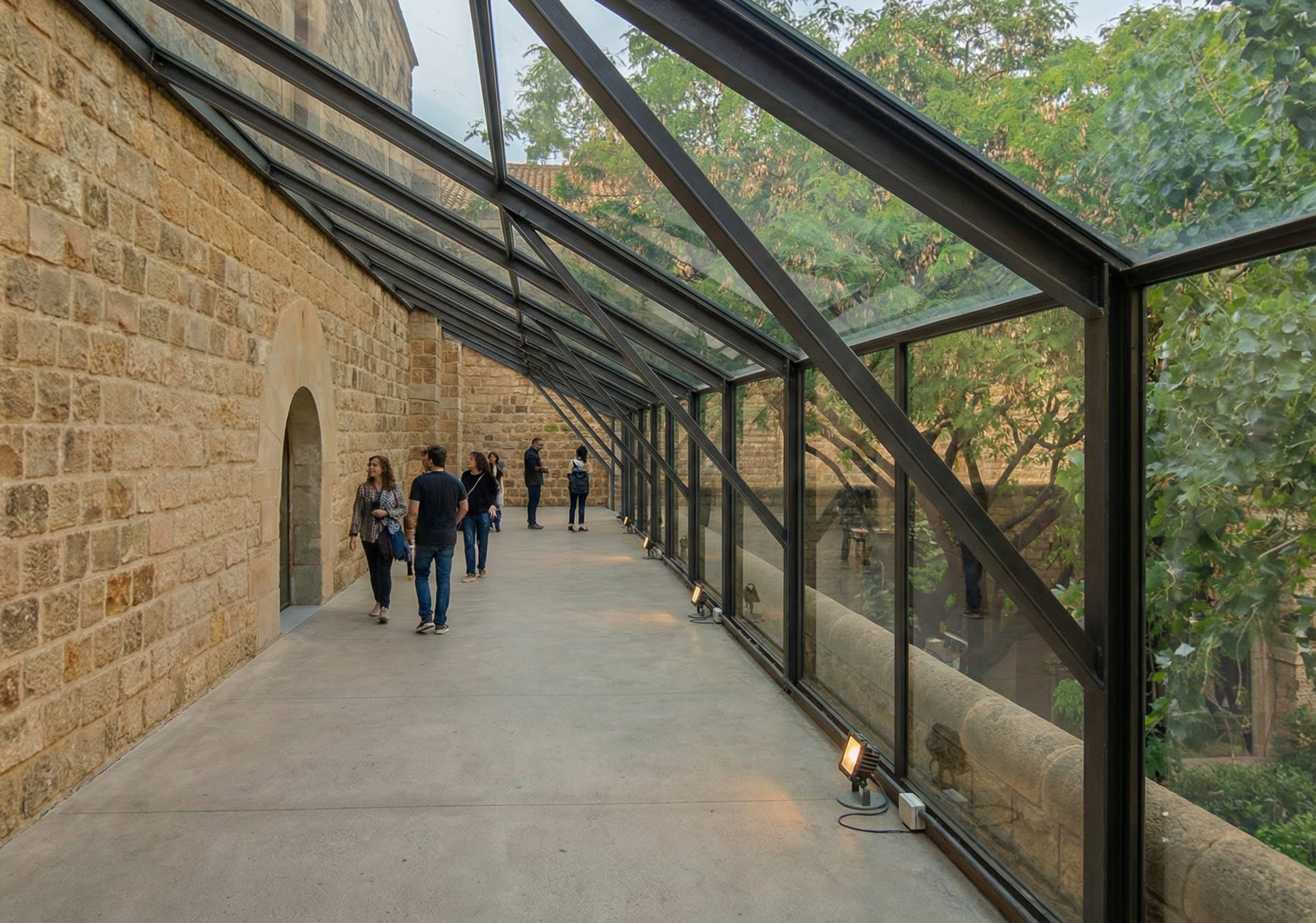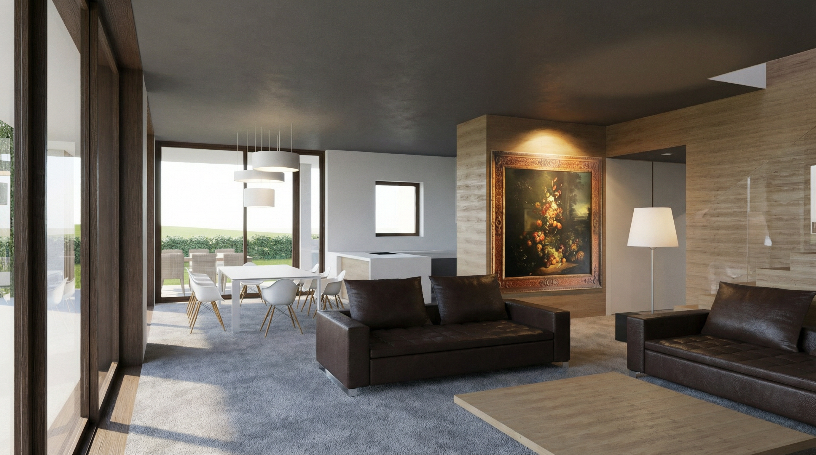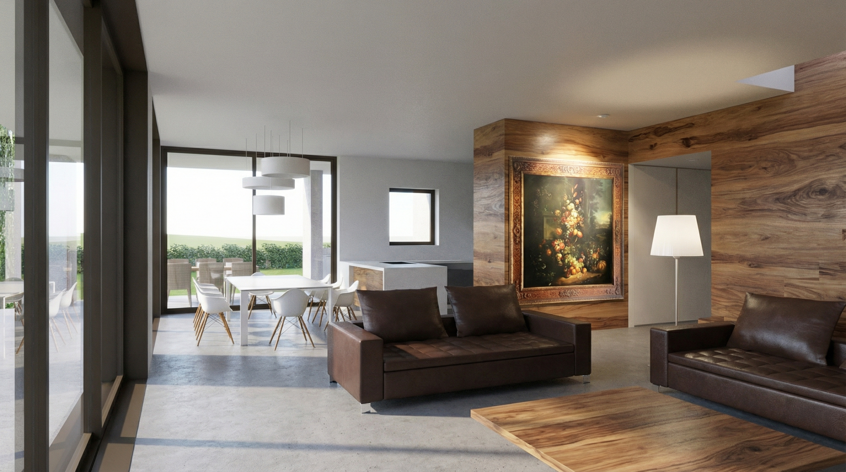create a modern airy cafeteria interior with clean lines and a welcoming atmosphere use light wood tones for the ceiling slats wall dividers and round table ensure large windows fill the space with natural lighting entering offering views of a cityscape the atmosphere should feel inviting and contemporary