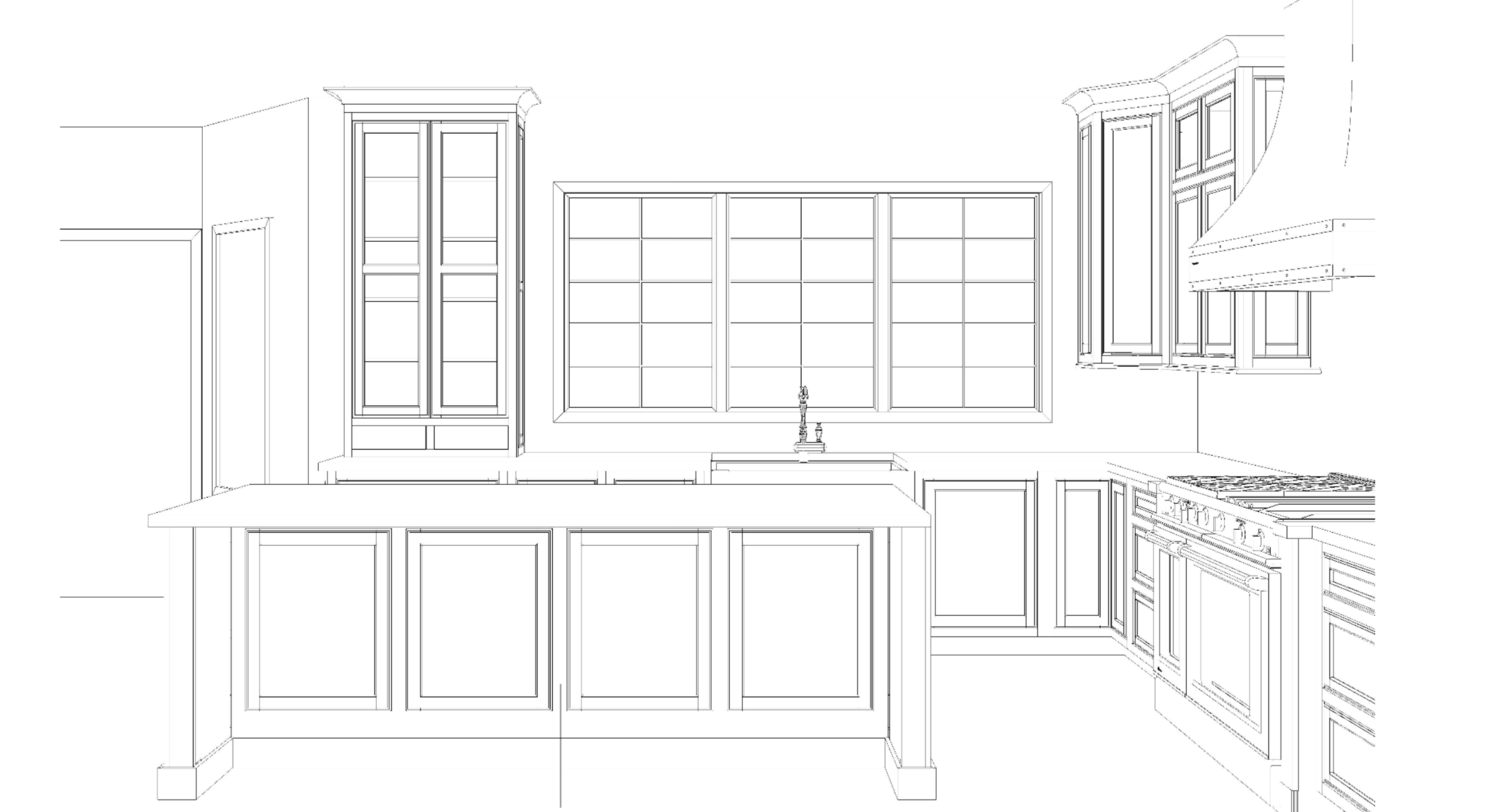 make this into a photorealistic rendering the cabinets around the window and stove are white the island is a light colored wood the hood is metal architecture