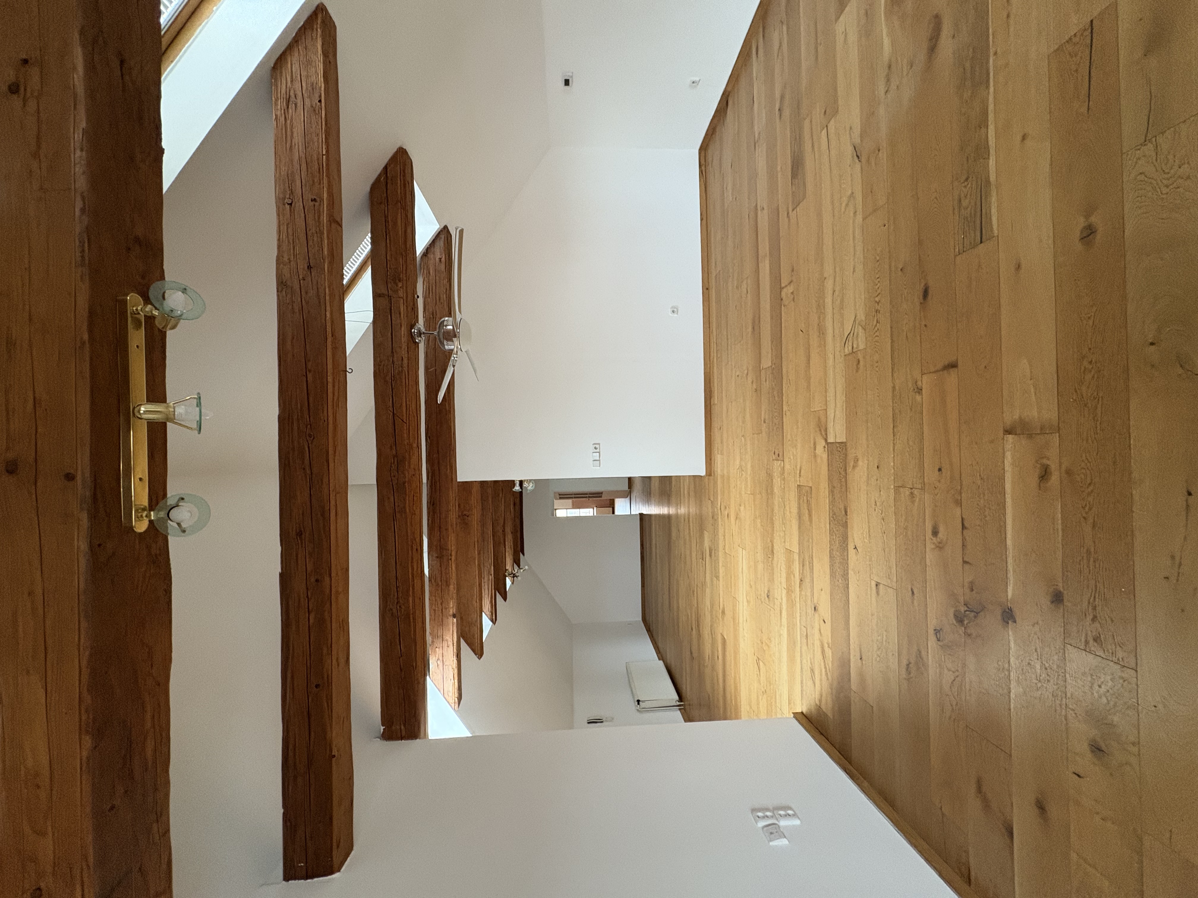 large open attic interior with wooden beams and oak floor natural light from roof windows in the front left area create a modern living space low profile sofa lounge chairs minimalist coffee table soft neutral textiles in the back left part design an extra long dining table for 10 14 people made of solid wood or brushed stainless steel elegant monolithic aligned with the beams style inspired by mies van der rohe but imagined in year 2025 combining timeless modernism with current design trends pure geometry luxurious natural materials high craftsmanship subtle warm tones stone steel leather glass add designer lighting flos viabizzuno style no rustic elements clean walls remain white atmosphere contemporary high end european designer loft spacious intelligent curated for architects and product designers ultra realistic cinematic light high resolution architectural digest quality