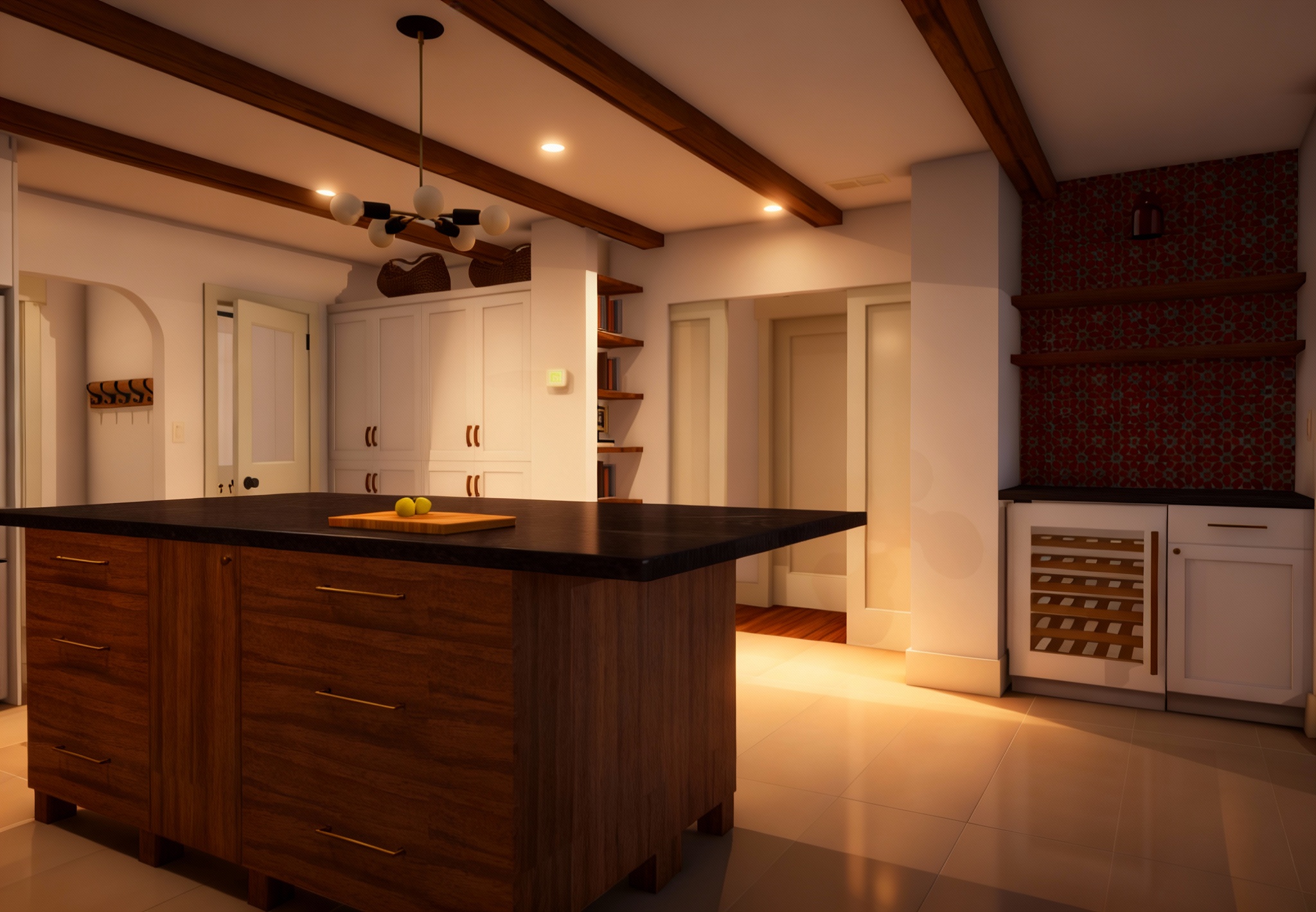 create a photorealistic rendering of this kitchen with soft lighting that is bright and warm