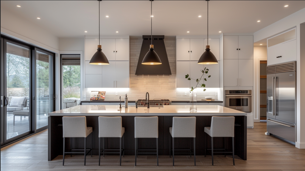 there are 3 pendant lights over the island remove the center one completely and then evenly space out the two over the island