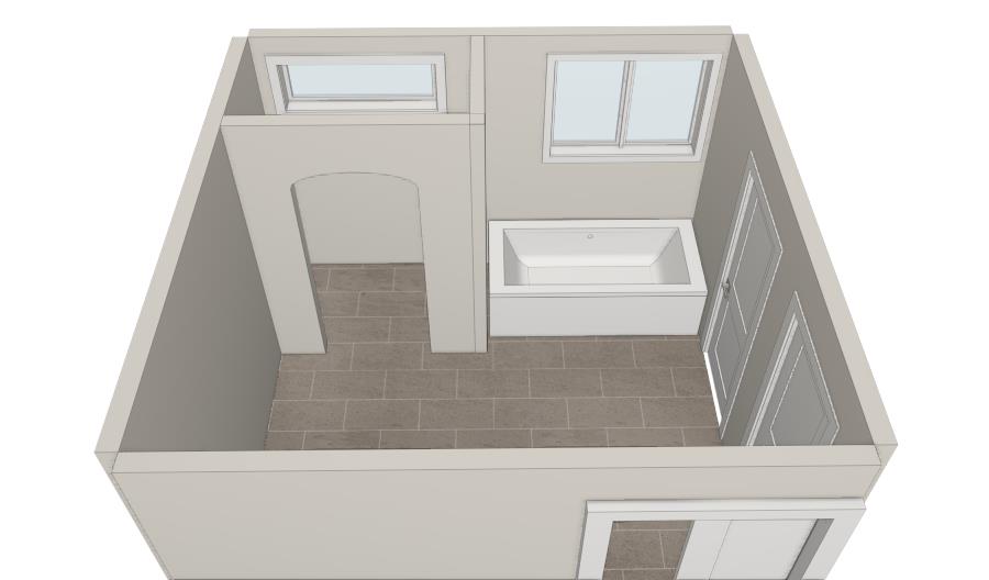 modernist interior shot turn the archway on the left into a beautiful black metal door with glass no divided lites put a shower inside the archway area include a beautiful light gray and warm white checkerboard flooring add marble to the tub surround and down the front architecture