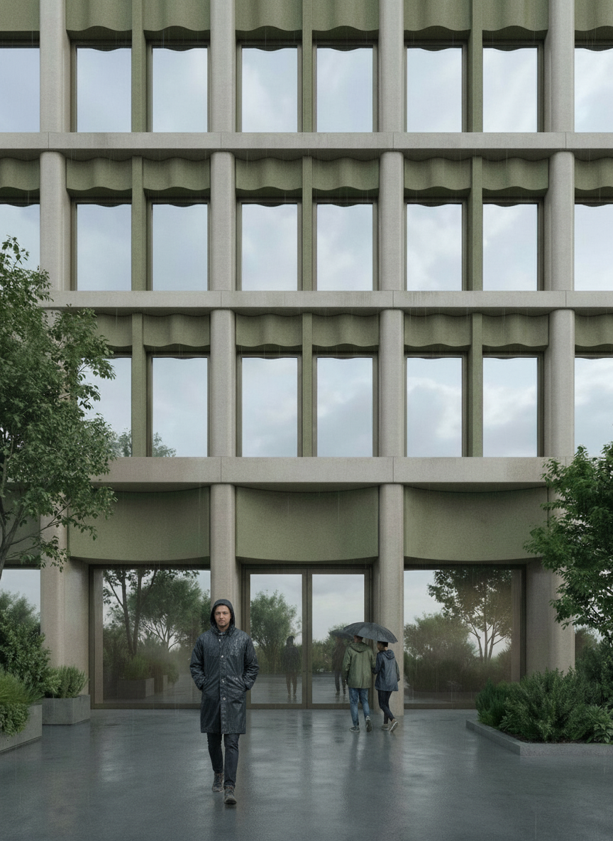 use the input image as a fixed architectural model do not modify any geometry materials lighting people vegetation or composition except the olive green curved panels above the windows on all olive green fa ade panel bands above the windows replace the current wave profile with a higher frequency wave each bay must contain at least four convex curves and four concave transitions the wave must be clearly articulated and segmented not smoothed into long arcs keep the same panel thickness depth height and alignment no other changes