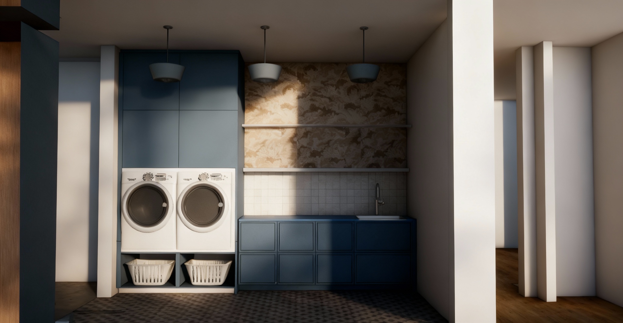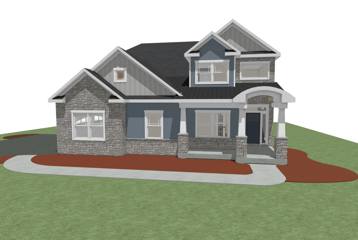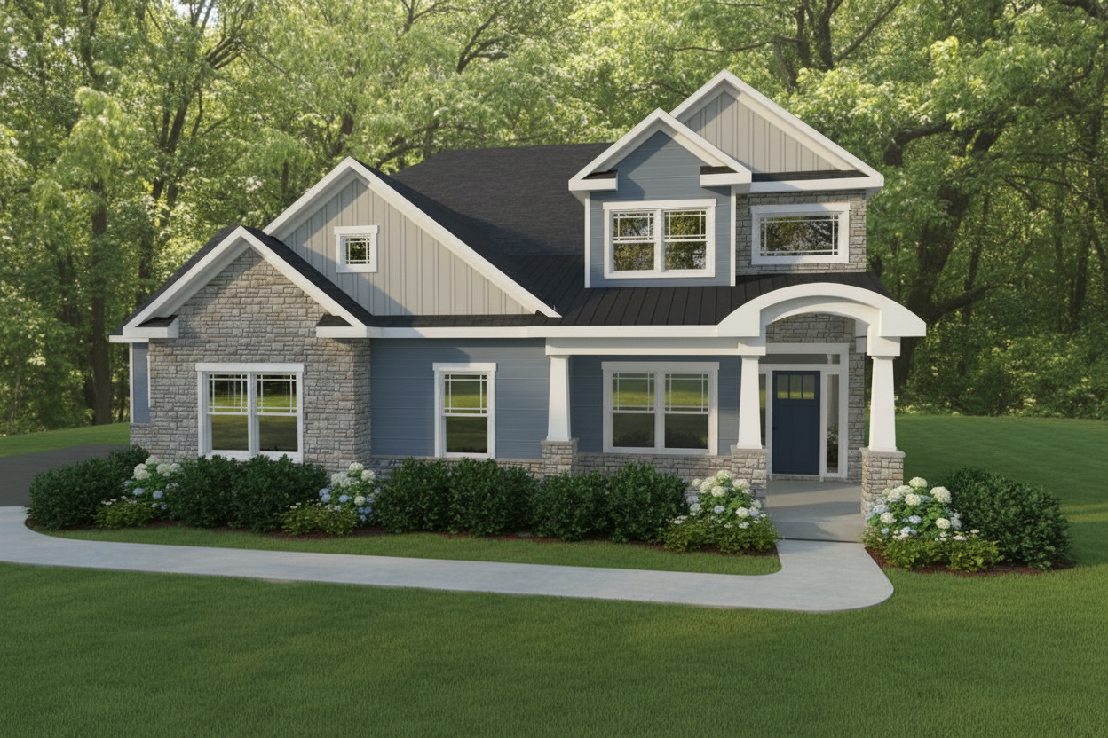 render this 3d image to appear photo realistic maintain all existing architectural materials and structural elements exactly as shown enhance the setting with a lush well maintained landscape include minimal beds manicured shrubs and a tree lined backdrop that frames the home naturally the windows should have a glossy finish with clear reflections of the surrounding trees and sky lighting should feel natural with soft shadows and realistic depth to bring the scene to life
