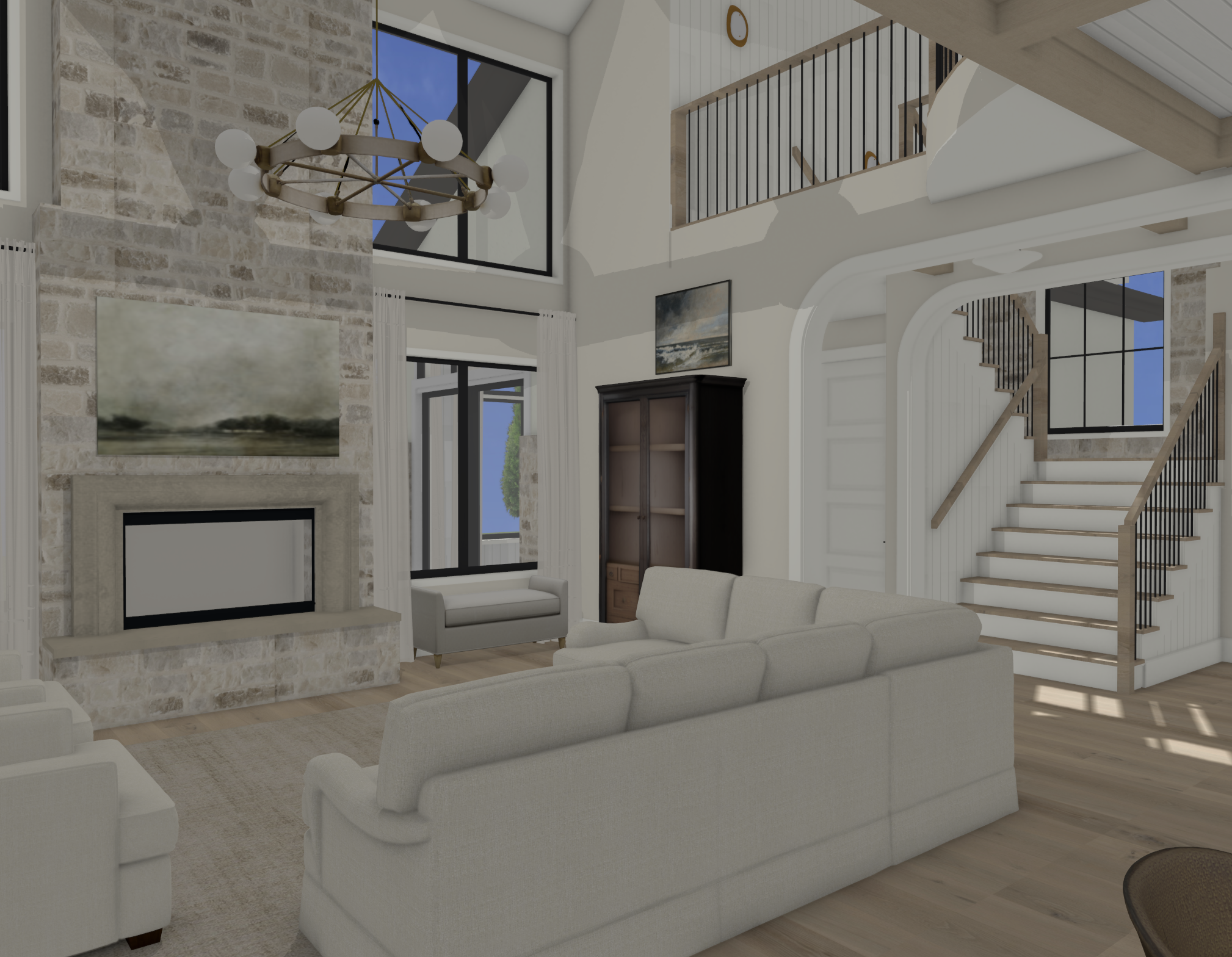 do not add anything to the rendering minimal background outside windows warm sunlight fire in fireplace