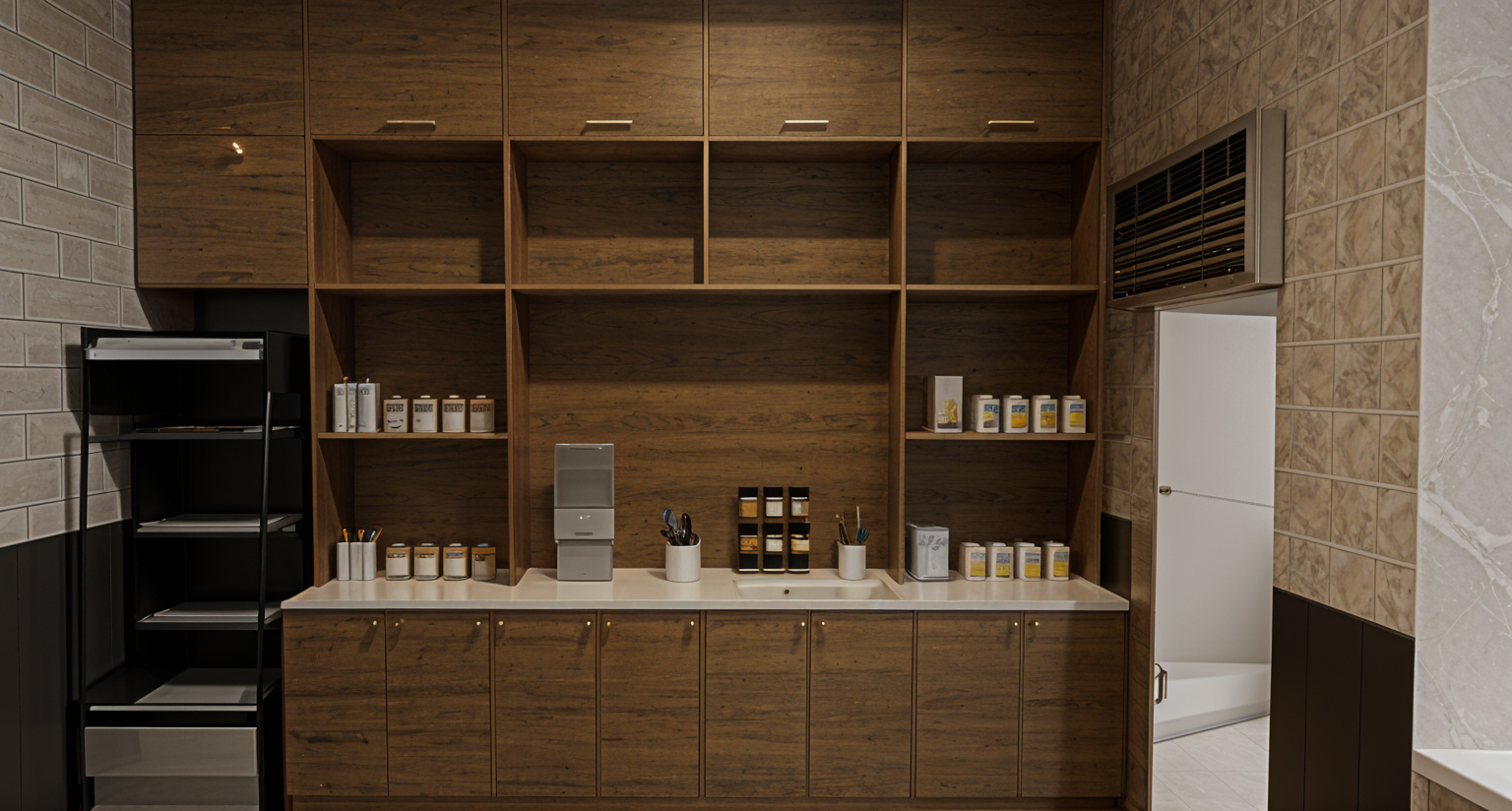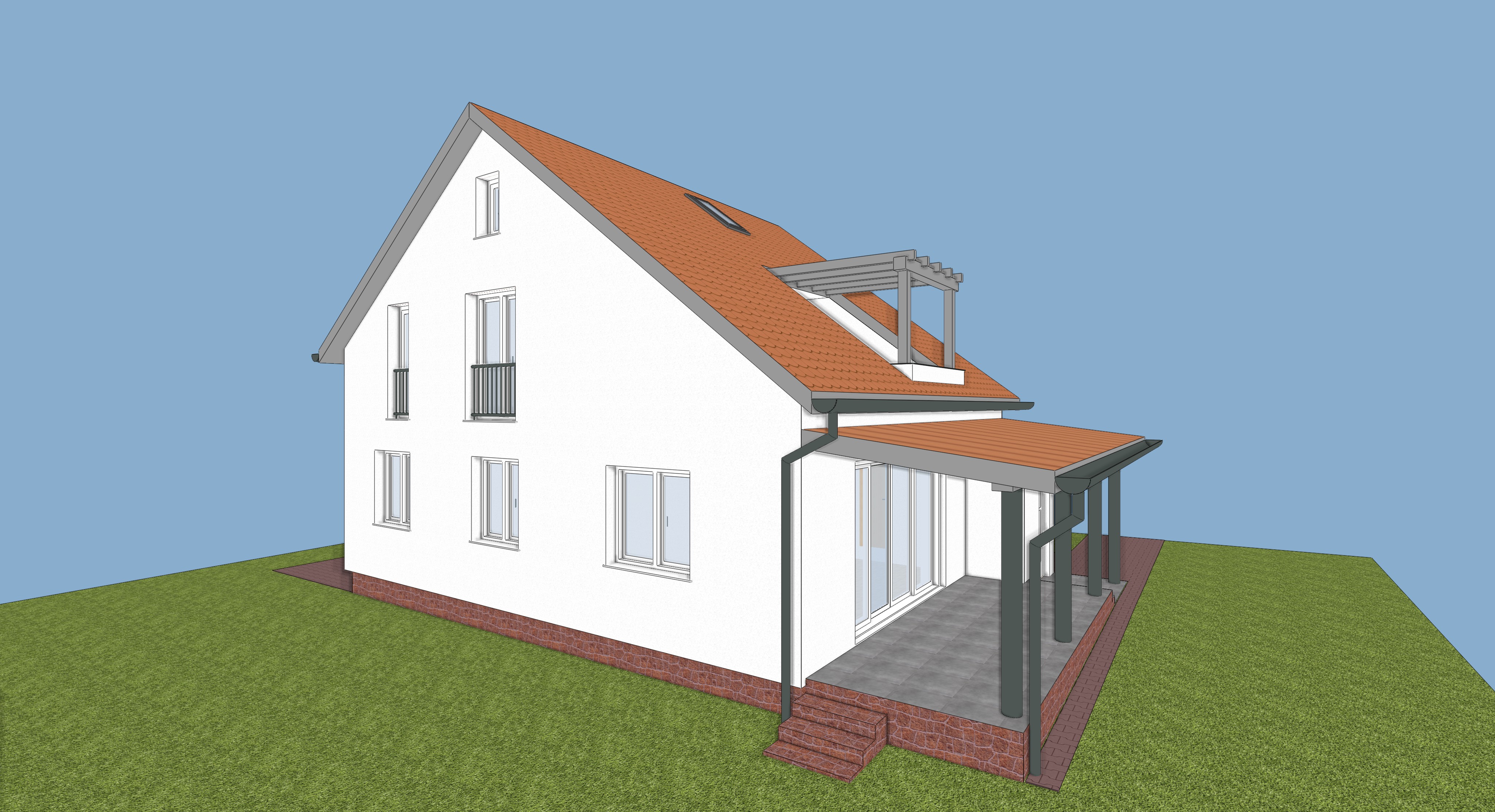 trees and bushes on the perimeter few house on the background clear sunny sky with some clouds light gray color on the wood parts of the roof dark gray color on the gutter and columns white plaster on the walls