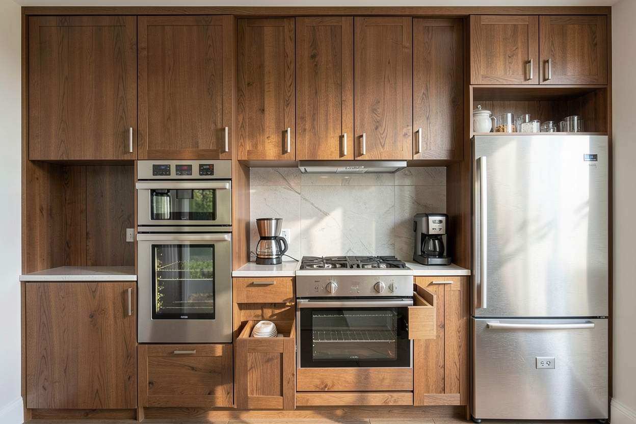 realistic interior rendering with golden hour natural sunlight coming in a window above a sink to the left of the scene looking through the kitchen and dining room into a living room with a fireplace on centered on the view patio door is behind the fridge on the left of the scene in the dining room