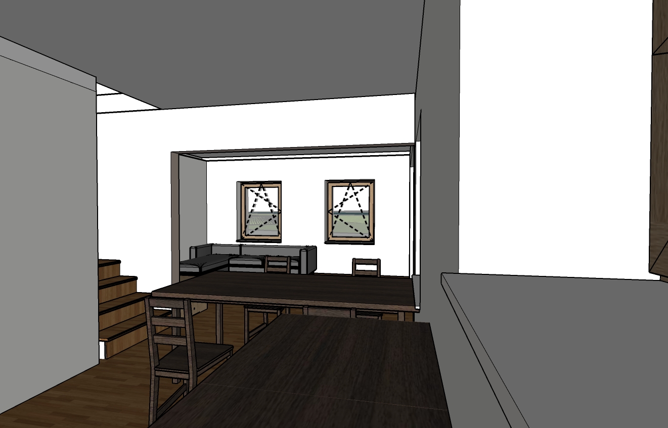 render a photorealistic 3d perspective the ceeling is in brick yousette use contempory furniture the flooring is in big tiles grey the wall are in ral 9010 put one plant