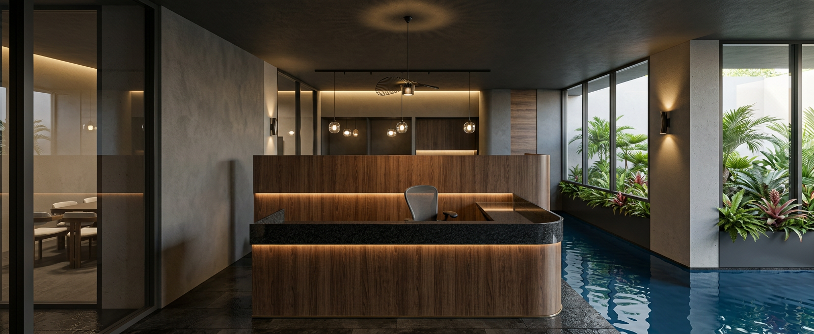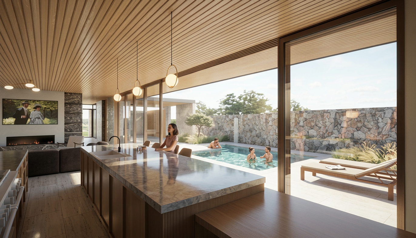 clean modern equestrian arena architectural exterior arena rendered in cinematic vibrant golden hour lighting with blue skies and vibrant clouds horse arena in a lush beautiful forest setting with green grass and dense trees surrounding the property warm glow and reflections off of the windows select grade horizontal cedar siding on the lower part of the structure and douglas fir board and batten on the upper portion of the arena green manicured landscape around structure with gardens and grass black standing seam metal roof high fidelity photorealistic visualization crisp shadow falloff refined facade geometry soft atmospheric depth premium architectural photography mood ultra clean composition and materials photorealistic render black trim around the windows and doors prominent trees scattered around the property black posts