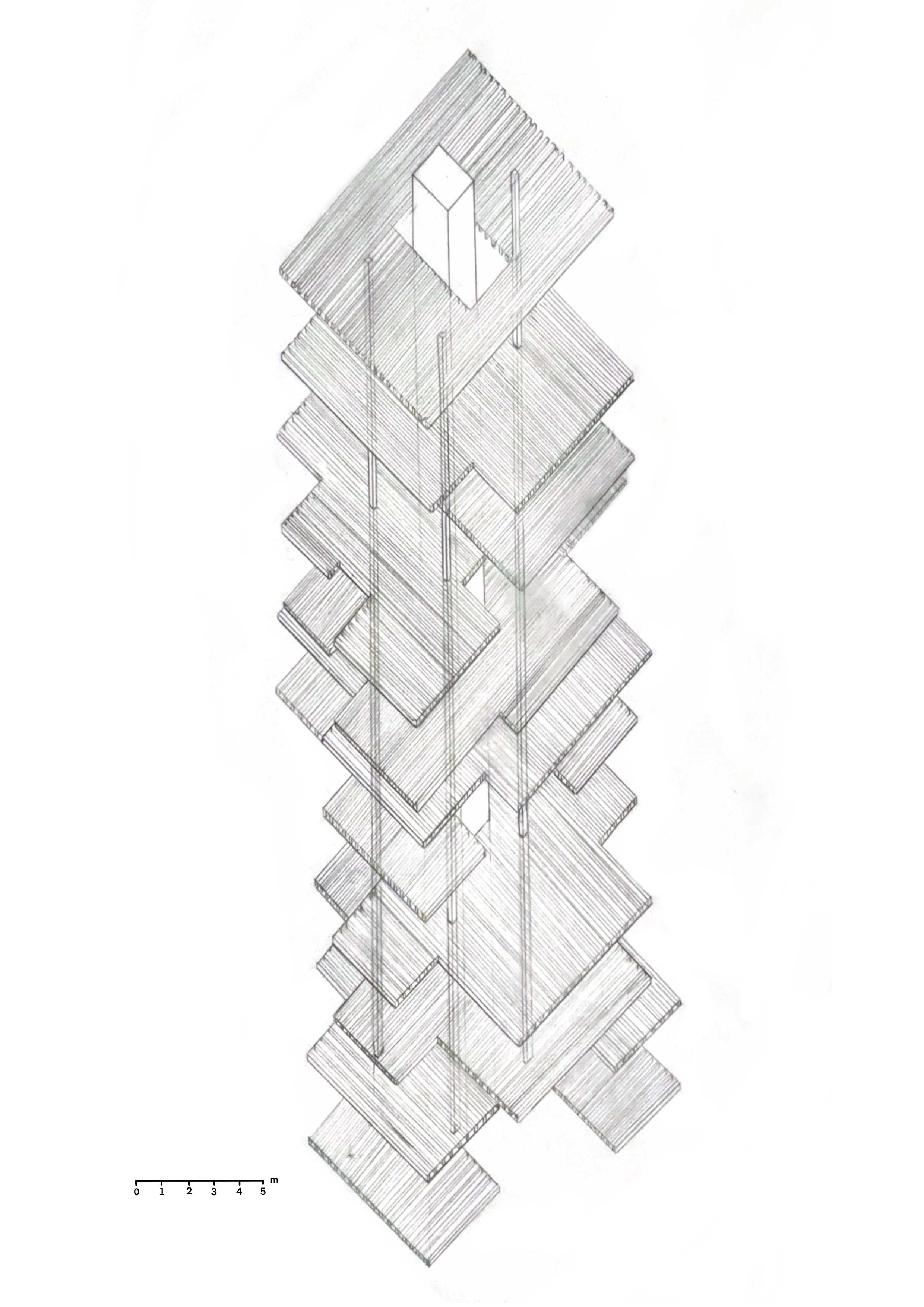 modernist perspective shot this shows the steel primary structure and timber secondary structure ass the materials to this drawing make it still look like a drawing architecture