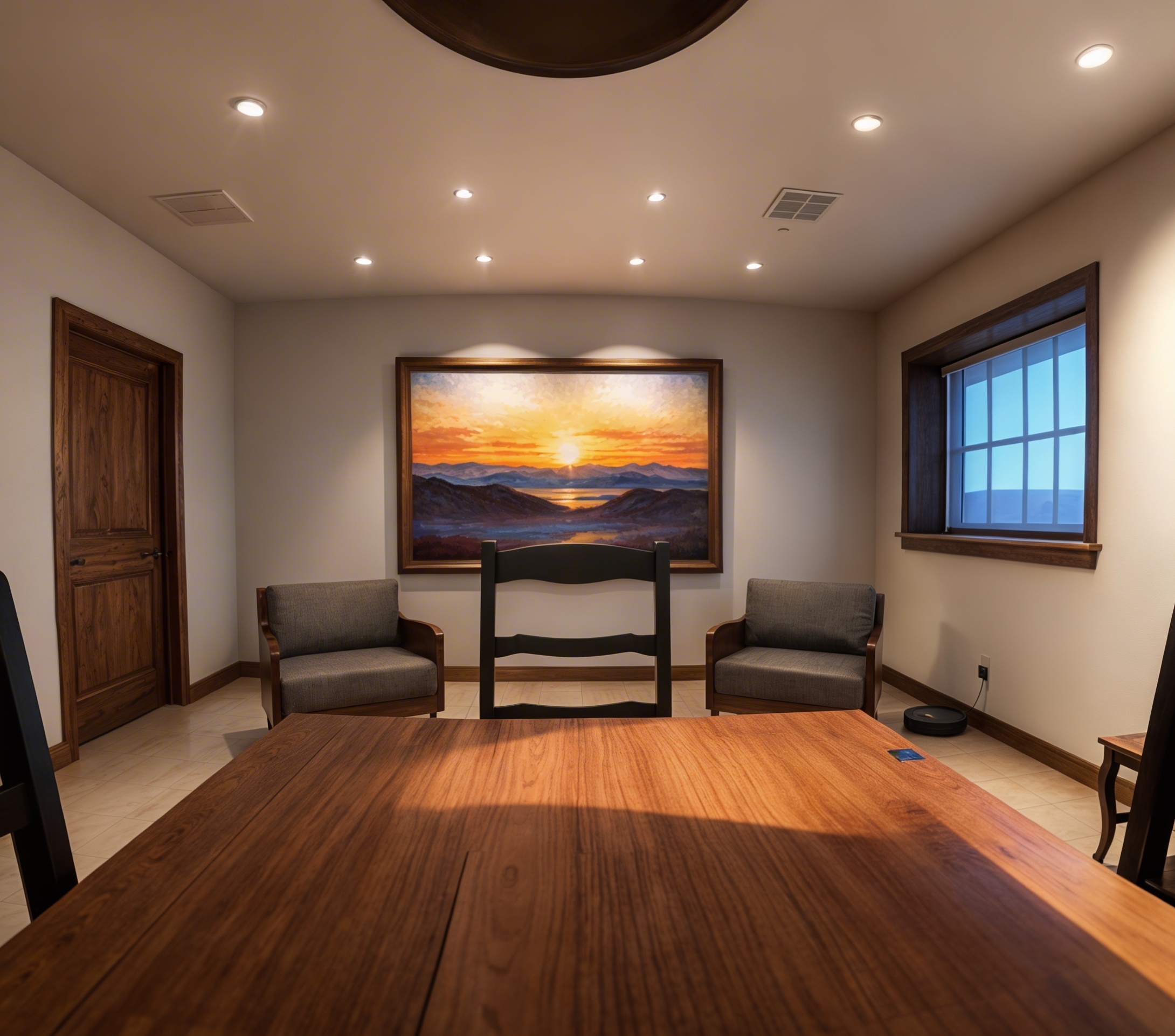 its a room whth two desks that is seperated with a glass sliding door from another room with two desks and e living room the desks are inox material