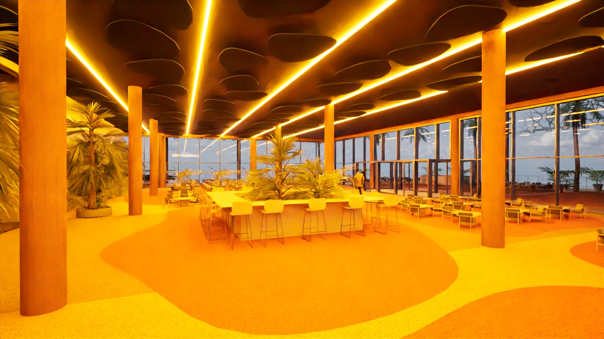 the image depicts a modern interior space with a futuristic design featuring large windows a yellow and orange color scheme and a combination of seating and standing areas the ceiling is adorned with circular patterns that are acoustic panels and recessed lighting contributing to a high tech ambiance there are many people sitting eating reading or using laptops the lighting is more subdued while retaining orange hues there is also vegetation mainly in pots