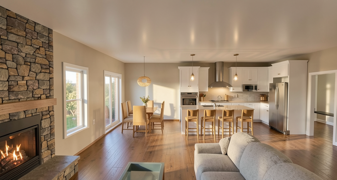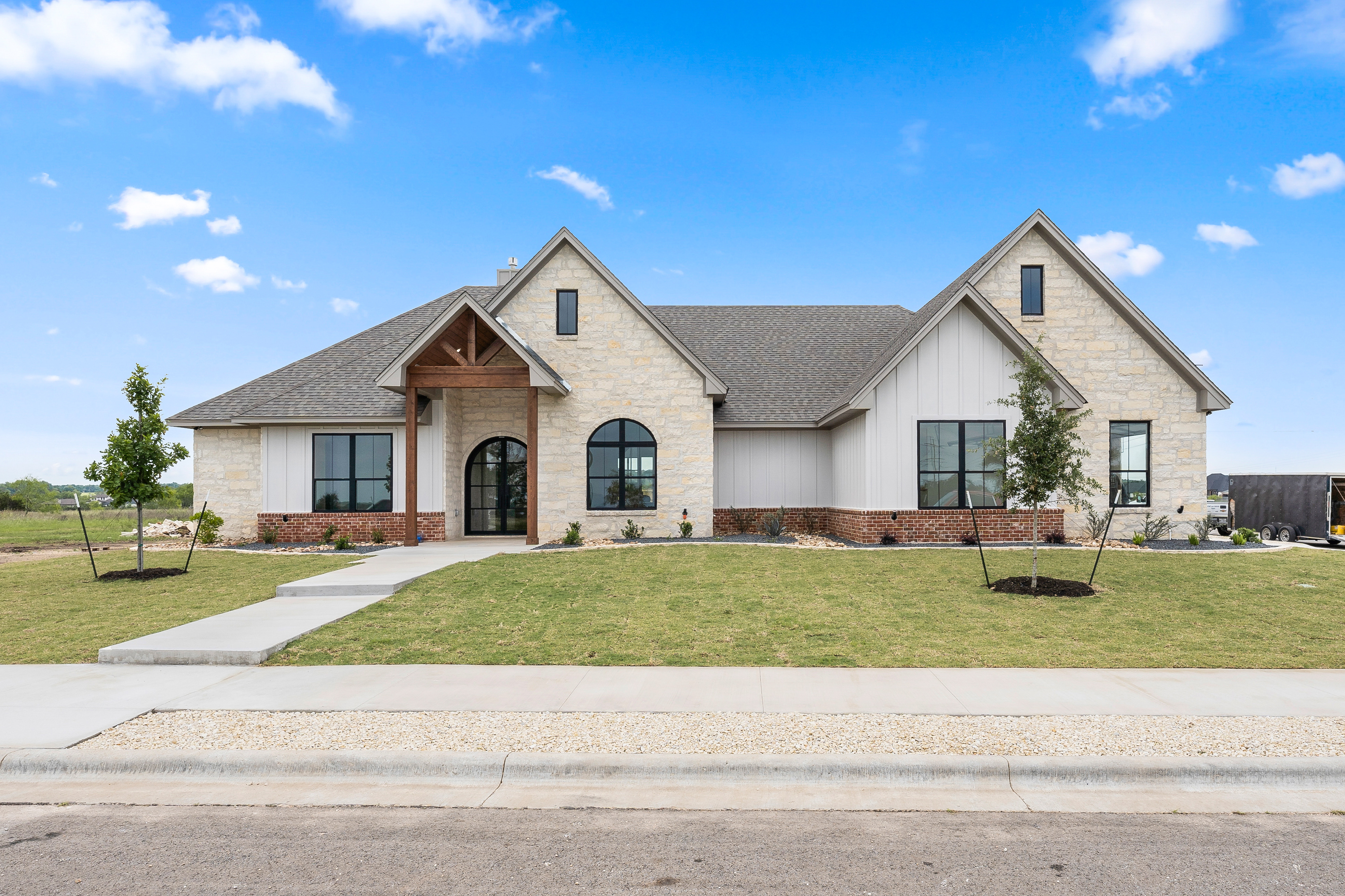 house is set on a large acreage lot with large trees in the background white stone