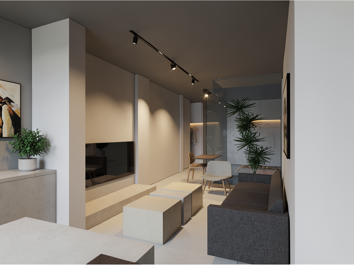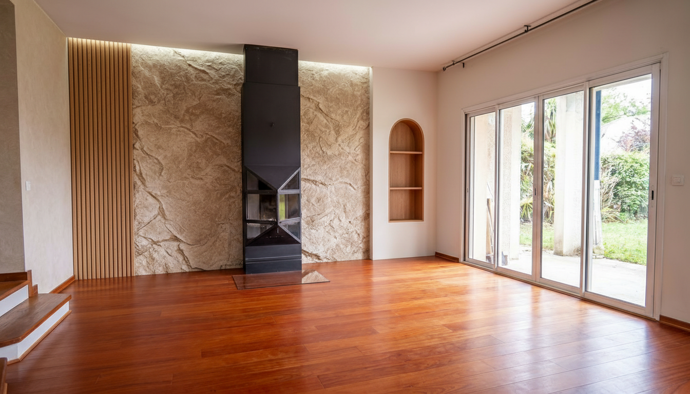 ad a tv on the wall on the left of the fireplace confortable grey and wood furniture