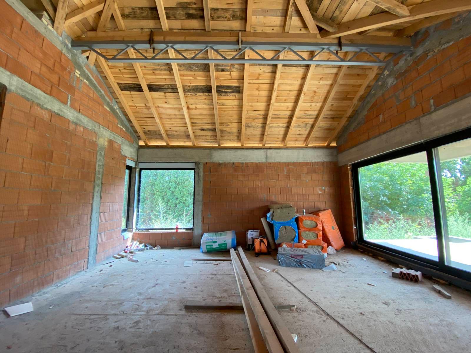 modernist interior shot comprehensive interior description sculptural modern luxury architectural concept finishes the space is a profound execution of sculptural modern luxury where raw monumental textures are refined into a cohesive warm minimalism the walls have been transformed into a composition of materials the main walls feature a warm sand toned micro cement while the entertainment and corner zones are accented with vertical dark wood fluted paneling for depth the floor is a seamless polished concrete in a smoke grey tone providing a neutral gallery like foundation recessed led strips are hidden within the steps leading into the main area for a subtle ground level glow ceiling surface and lighting the entire overhead surface is finished in a raw tactile concrete with a warm grey earthy texture that provides a muted matte appearance the lighting is a primary decorative and functional element consisting of a series of long linear led bar pendants suspended by ultra thin black wires these light bars are arranged in a dynamic overlapping geometric pattern casting a soft yet precise glow across the textured concrete surface furniture layout zoning 1 the media tech zone left wall positioned against the left wall is the primary entertainment and home technology hub a long low profile floating media console in charred oak runs along the base featuring a specialized woven wood insert on the right side centered above it a large ultra thin flat screen tv murphy unito 26 is wall mounted with all cabling invisible to the far left a minimalist black metal rack cabinet is discreetly built in housing the home s fiber optic and smart systems 2 the primary lounge back and right corner the main seating area is anchored in the far right corner designed for a blend of comfort and sculptural appeal the sofa a massive modular murphy unito 26 sectional in a rich cream colored boucl fabric it follows the l shape of the back and right walls the accents styled with a curated collection of pillows in deep navy blue velvet and the signature poncho striped textile featuring earthy brown blue and cream tones the daybed tucked into the far corner angled precisely between the sofa and the large glass sliding doors is the poncho daybed upholstered in the horizontal striped pattern it serves as a sculptural transition between the interior and the garden 3 the foreground social niche closest to camera closest to the viewer are two sculptural armchairs with organic rounded silhouettes upholstered in a light taupe textured weave they are positioned facing the center between them sits a low circular side table made of solid light oak 4 the centerpiece the middle of the room is defined by a layered rug configuration a large dark charcoal flat weave rug topped with a smaller circular high pile white shag rug on top sit two tiered coffee tables one with a dark reflective glass top and the other in a matte black metal finish architecture