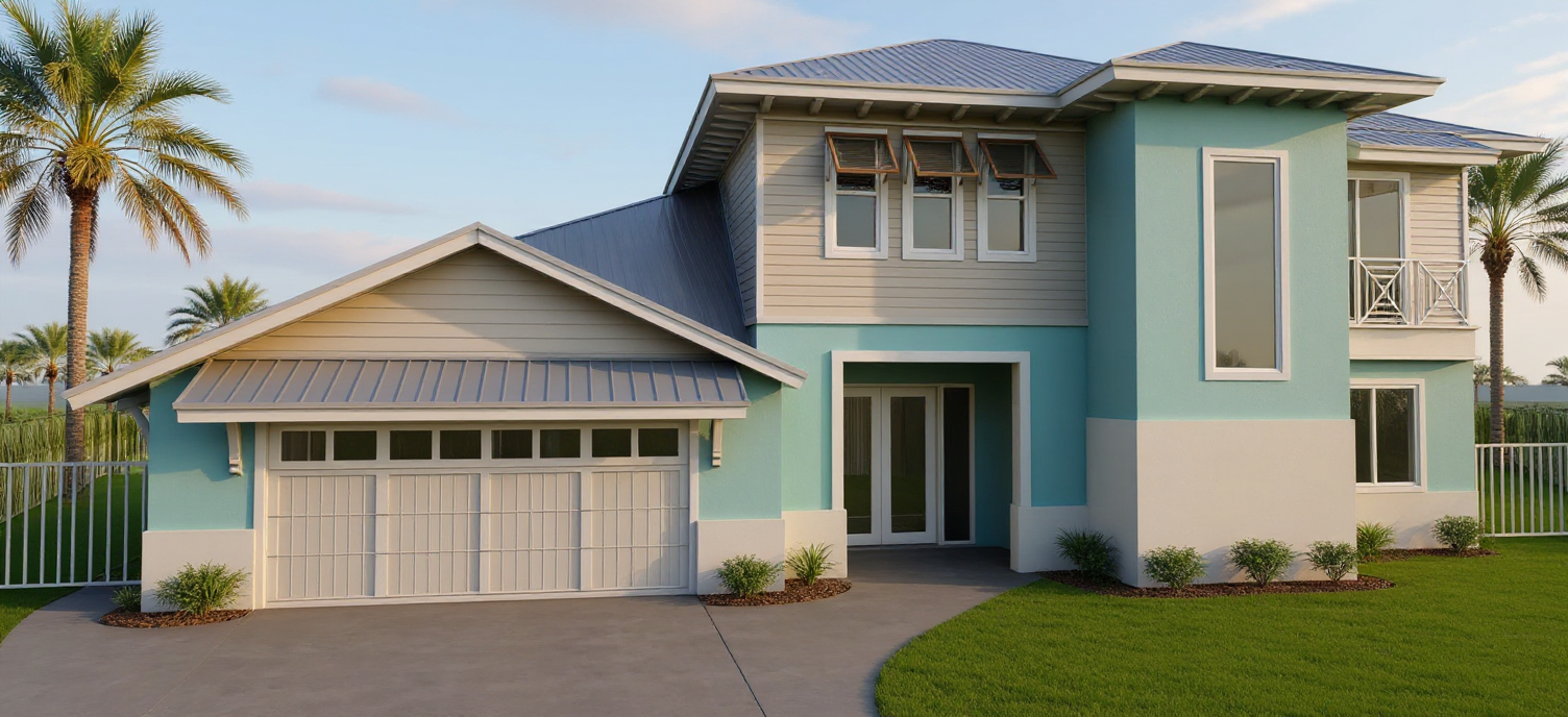 building is smooth white color symmetrical building facade add road in front with 1 passing car add 3 people walking in front add tropical country trees in the background no side fence no side road just landscape