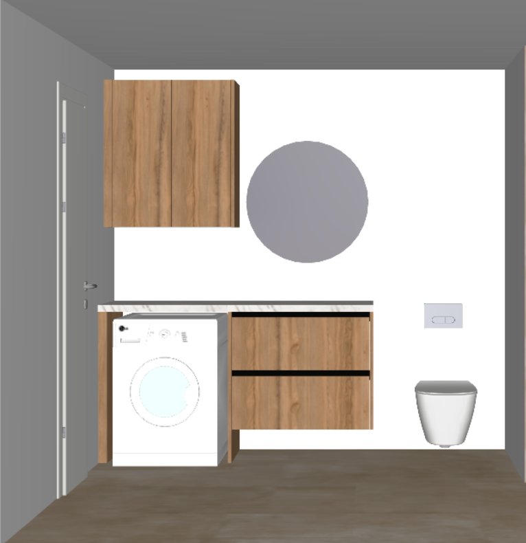 create a modern bathroom scene with a minimalist aesthetic feature light oak wood cabinets with a smooth natural grain texture use a soft cream beige color for the walls creating a warm and inviting atmosphere the floor should be a rich slate gray with a subtle shine to enhance the modern feel include a sleek white washing machine with minimalist controls the toilet should be a smooth elegant white ceramic add a round mirror with a simple silver frame for a touch of elegance emphasize natural lighting to create a serene tranquil atmosphere