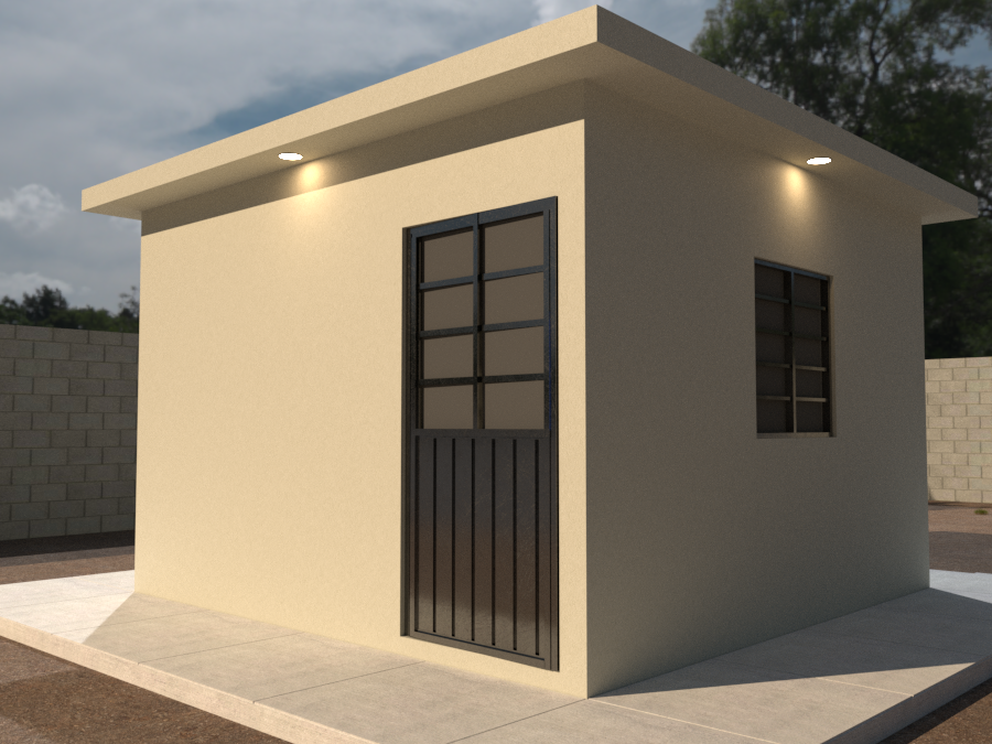 public works social housing module render small single story support room low cost construction fixed budget institutional style clean beige plaster walls gray metal door and window concrete base flat roof realistic daylight soft shadows rural semi urban context compacted dirt ground simple sidewalk human scale reference documentary style dignified social housing non luxury functional government project visualization