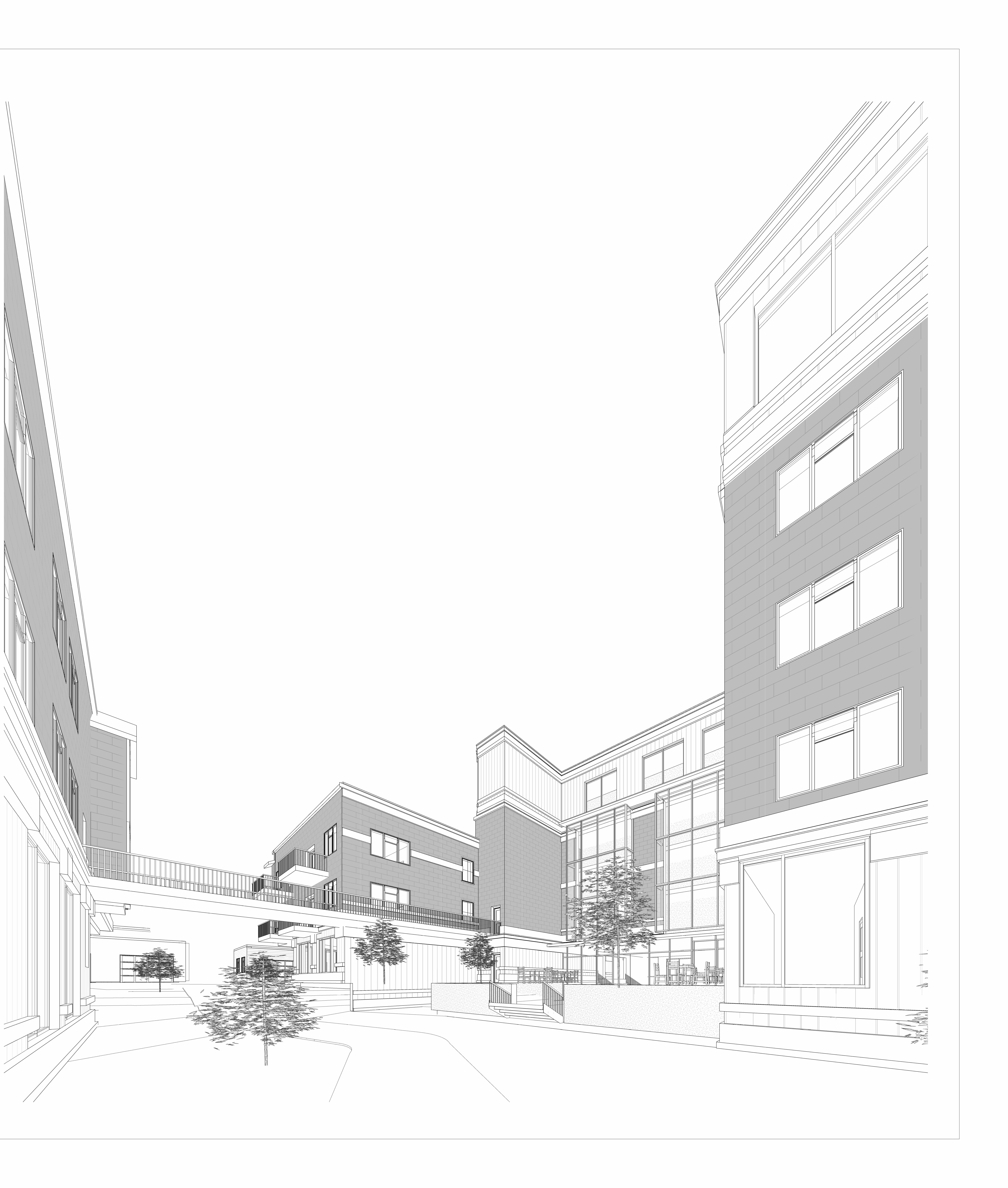 keep all building geometry fa ade details massing and proportions exactly the same do not alter any windows materials or architectural forms maintain the original camera angle and perspective transform this space into an active pedestrian alley corridor during early evening golden hour add warm caf style string lights running horizontally across the alley in the east west direction suspended between the buildings on the left bring the flower shop to life add lush outdoor plants hanging baskets small display tables potted flowers spilling onto the walkway and warm interior lighting glowing through the windows on the right activate the bistro patio with tables chairs people dining soft lantern lighting and warm reflections on the glass add subtle planting beds and landscape lighting populate the alley with diverse students walking from morgan view small groups chatting someone with a skateboard couples walking toward the activated alley spine and a few people sitting near the bistro patio keep all figures correctly scaled and naturally lit add soft shadows accurate global illumination physically realistic materials depth of field reflections and a high dynamic range sky maintain a warm inviting ambiance with subtle atmospheric haze emphasize safety vibrancy community and high realism without modifying the architecture create a 2025 level photorealistic rendering with cinematic detail high fidelity textures and full frame camera realism
