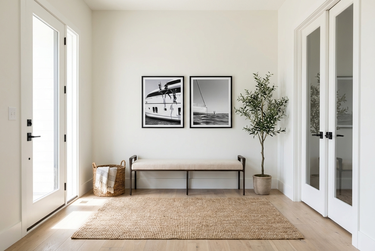 remove the door on the left side make the doors on the right solid shaker doors also create a walkway to the kitchen on the right side of the plant
