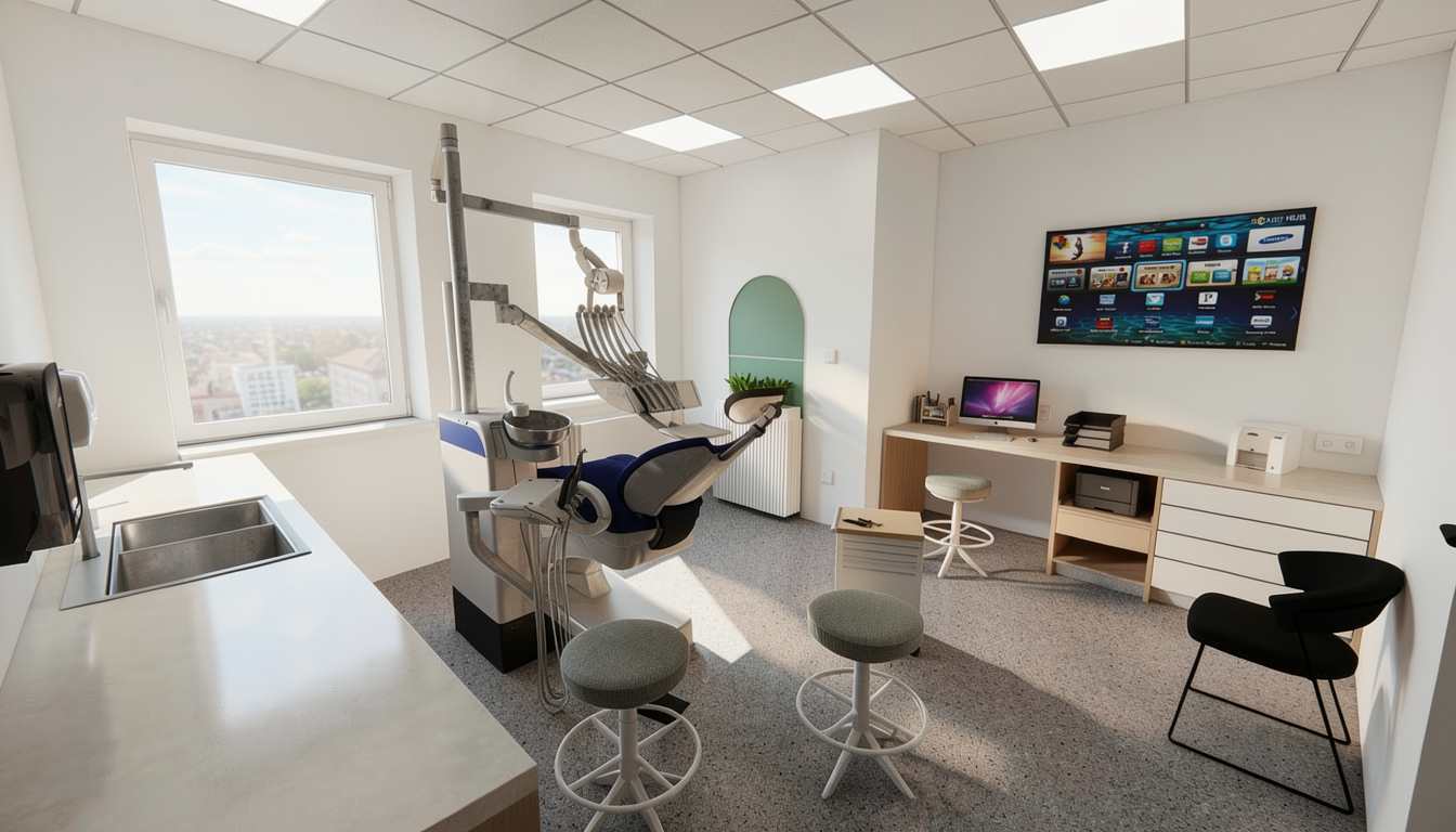 make a render tune the texture to realistic make the wiev to perspective make the view trought the window with a town panoramatic change in the dental chair unit the metal round sink to white