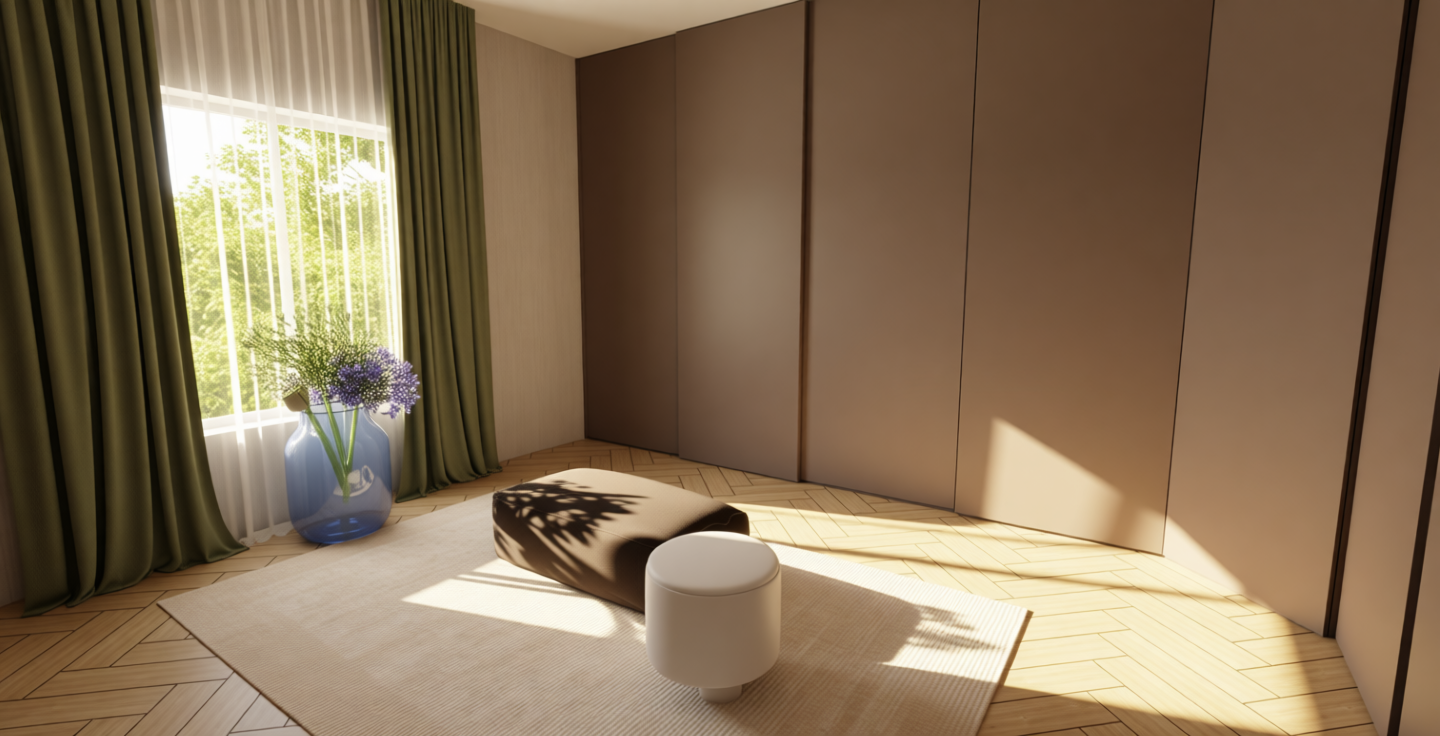 a cozy elegant bar lounge with a warm inviting atmosphere the bar area features rich mahogany wood with a polished dark cherry finish the shelves are backlit casting a soft amber glow the bar stools are made of dark walnut wood tables have a deep burgundy surface with soft beige cushions and poufs for seating the walls are painted a deep charcoal gray adorned with classic art pieces in golden frames pendant lights with mint green shades hang from the ceiling adding a touch of color the floor is covered in a herringbone pattern with earthy tones completing the sophisticated ambiance dim ambient lighting creates a serene intimate mood