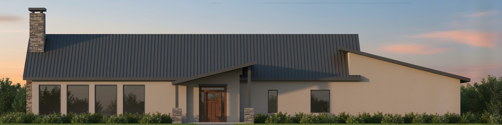 design and implement a modern suburban house with a clean stylish and contemporary architectural design the exterior white walls are white but not spotless giving the building a sharp minimalist and elegant look the dark grey wall is black dark grey rustic brick cladding slightly satin finish creating a sophisticated contrast with the white facade the solid elements of the fence are also white the overall atmosphere is peaceful and friendly it is illuminated by soft natural but cool light under a partly cloudy slightly twilight sky the mood after the rain in a quiet place with puddles reflecting the surroundings or the house there should be two large trees on the right and left sides of the house in front of the house is a 120cm wide sidewalk in front of the sidewalk is a slightly not spotless cracked asphalt road in places the house is surrounded by greenery with well maintained landscaping and abundant vegetation which lends tranquility and natural beauty the garden has a variety of plants and green vegetation creating a rich livable outdoor environment in the background is a flat open field distant tree lines and a calm horizon which gently blends into the suburban environment the driveway and access road are paved with clean gray paving stones ensuring that there are the windows are facing the landscape remove the car from the picture realism should be enhanced with detailed material textures soft shadow props realistic window reflections ambient blur and balanced natural lighting ultra high resolution photorealistic architectural visualization cinematic composition realistic materials modern suburban lifestyle the camera looks at the house from afar