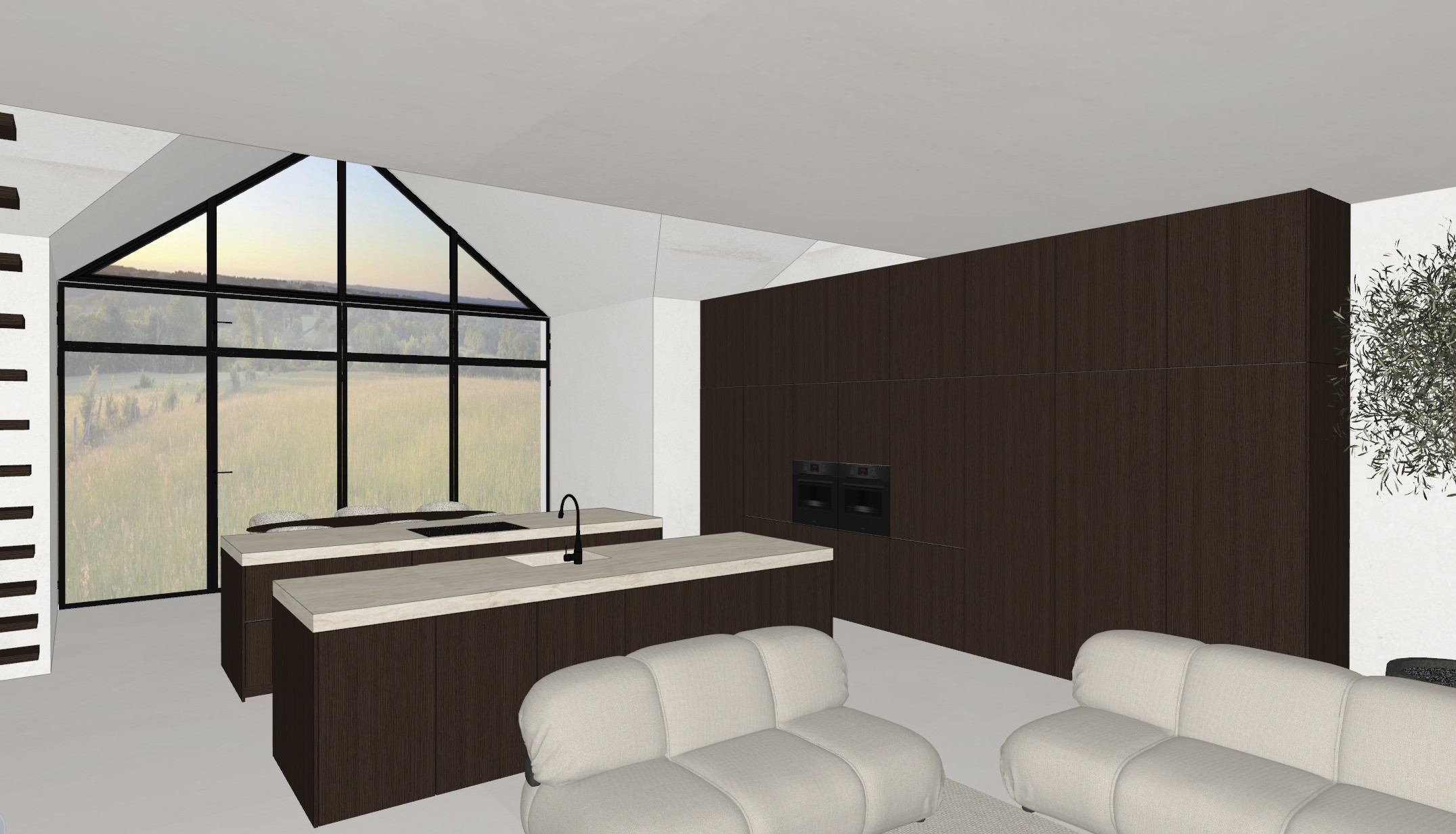 beautiful luxury dark veneered kitchen with a thick travertine worktop the floor is a light warm cement and the general vibe is japandi
