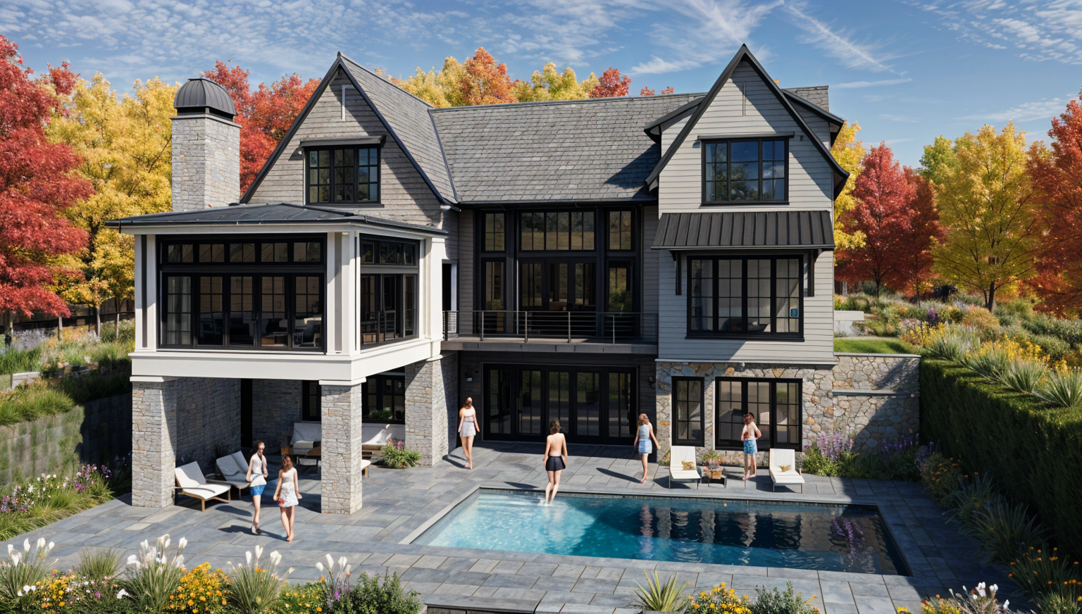 change patio to bluestone pavers change driveway to granite cobbles no plants on driveway change white stucco to light gray lap siding make wood garage doors darker add lush fall landscape in background add plantings to grass areas change roof to gray wood shakes make gable on garage light gray siding add person walking up to entry add tree in front left foreground add potted plants and a bench to front patio architecture