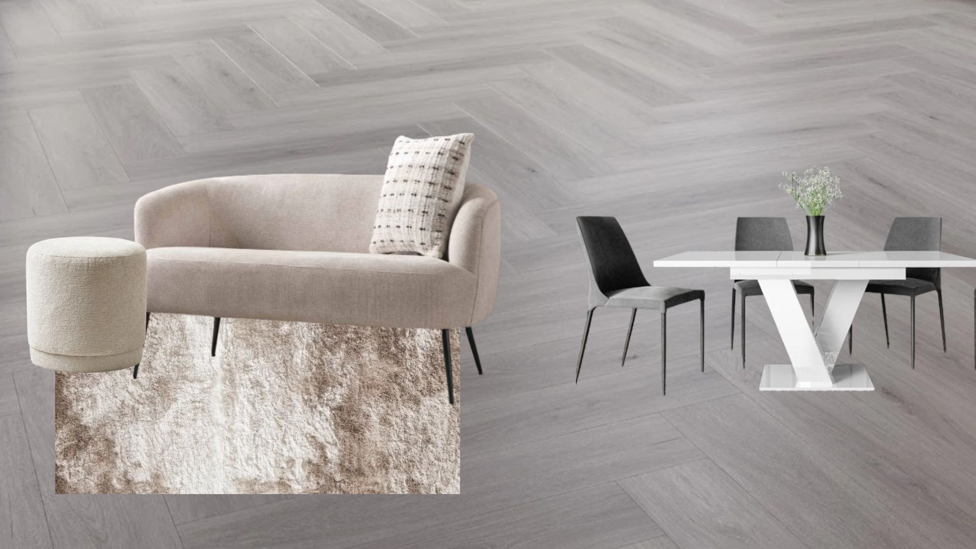 keeping the flooring as grey herringbone please place these arrangements in a room with white walls