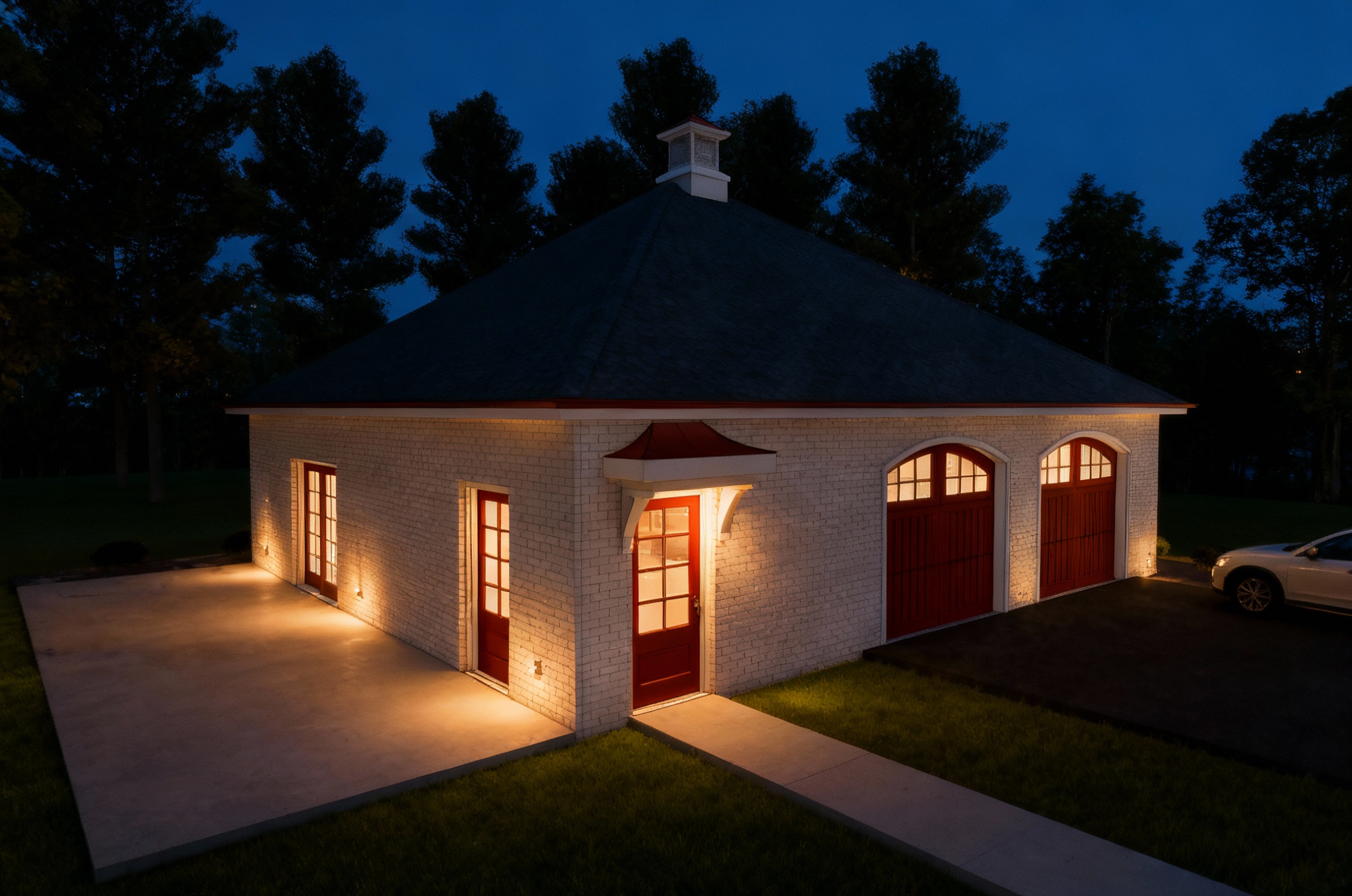 add lighting car to right side of the image add people to the left side of the image night with full moon