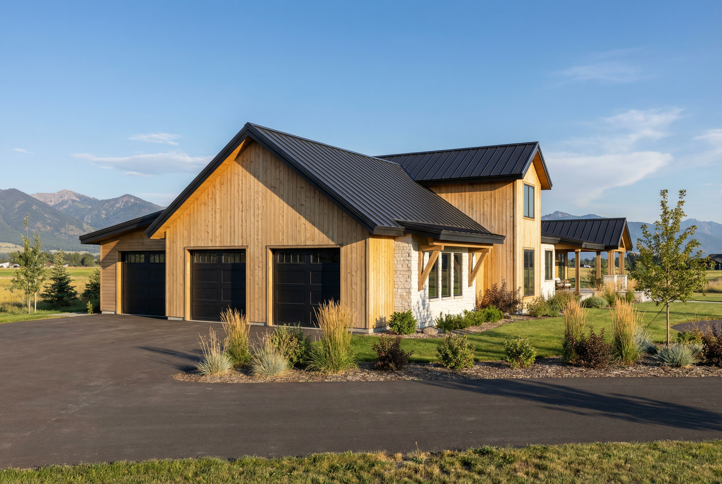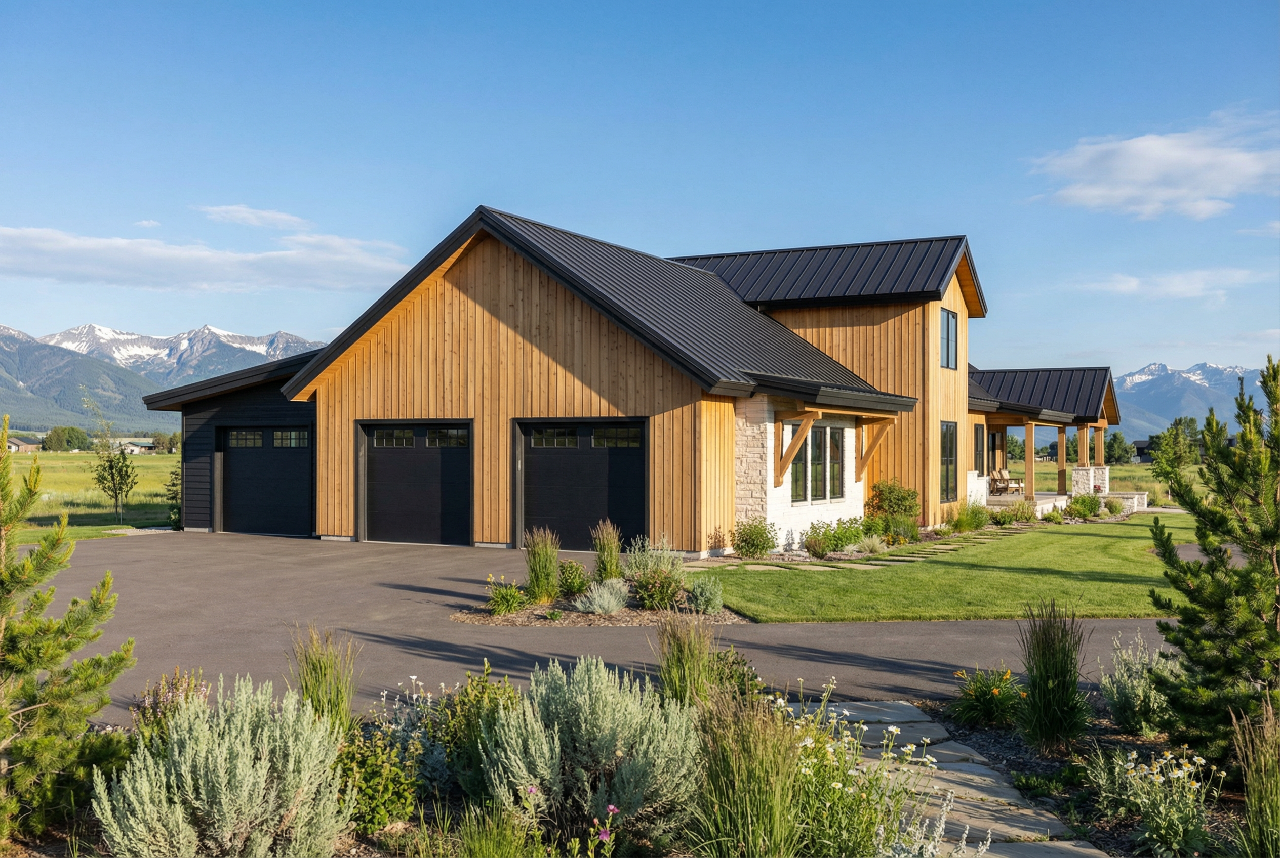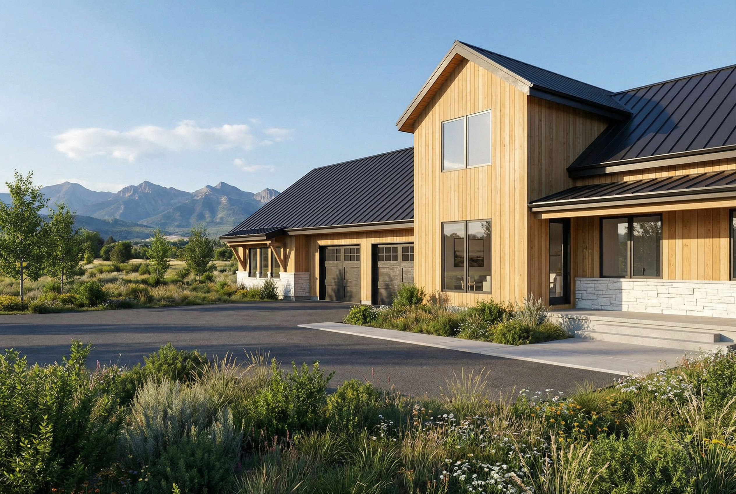 it s important to keep the sizes of everything the same change textures and materials but keep the sizes of everything the same make rock realistic its important to keep to scale this room is big do not change size of windows or doors do not add doors or windows do not change or add fixtures warm modern luxury bathroom with light gray marble or quartzite subtle veining polished finish light natural wood cabinetry mixed with painted off white cabinets flat panel doors minimal hardware soft warm lighting pendant over tub brushed brass accents tall brass faucet neutral color palette creamy whites warm taupes light wood tones wide plank oak flooring clean and minimal styling high end residential design soft ambient glow architectural visualization ultra realistic 8k detail back ground in pine trees and montana vegetation add shelf between tub and window dont add vanities